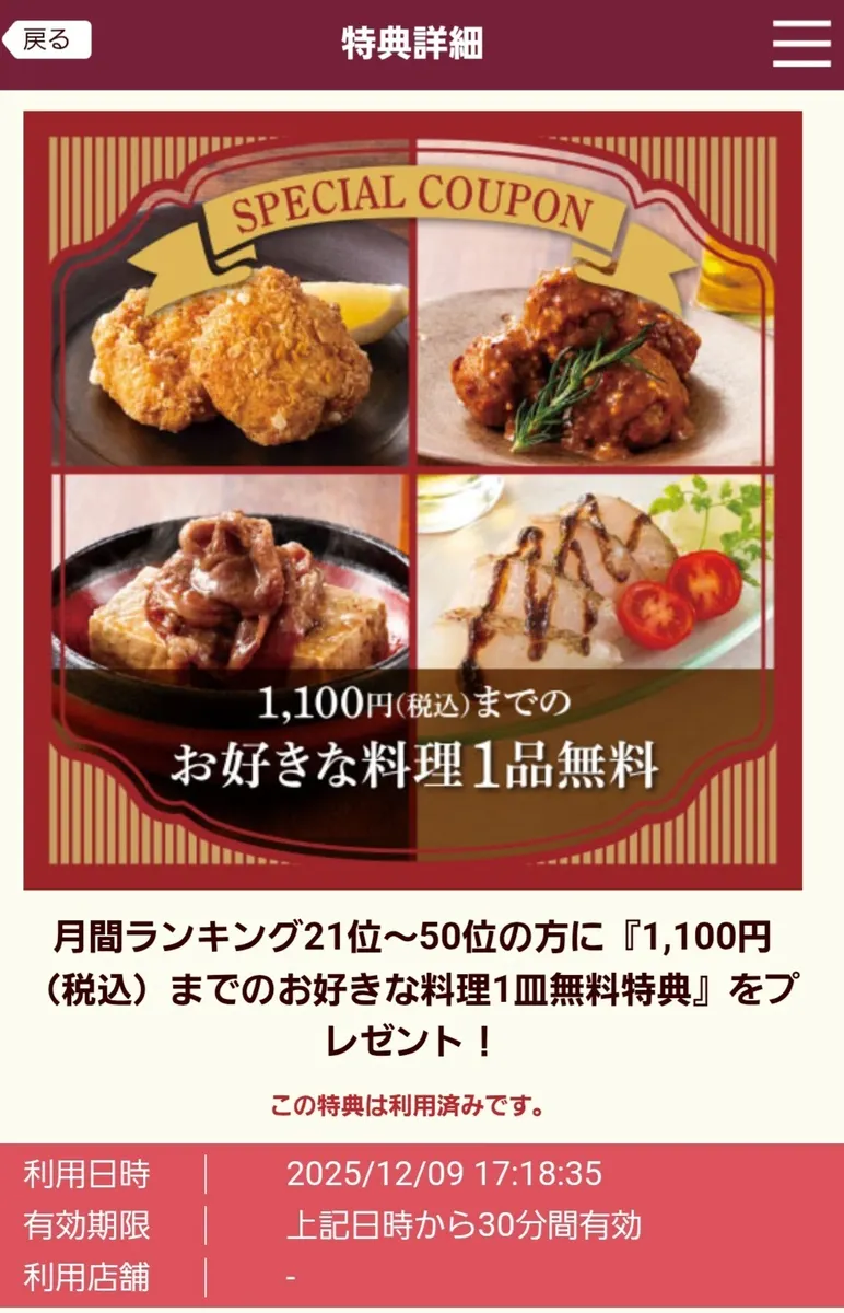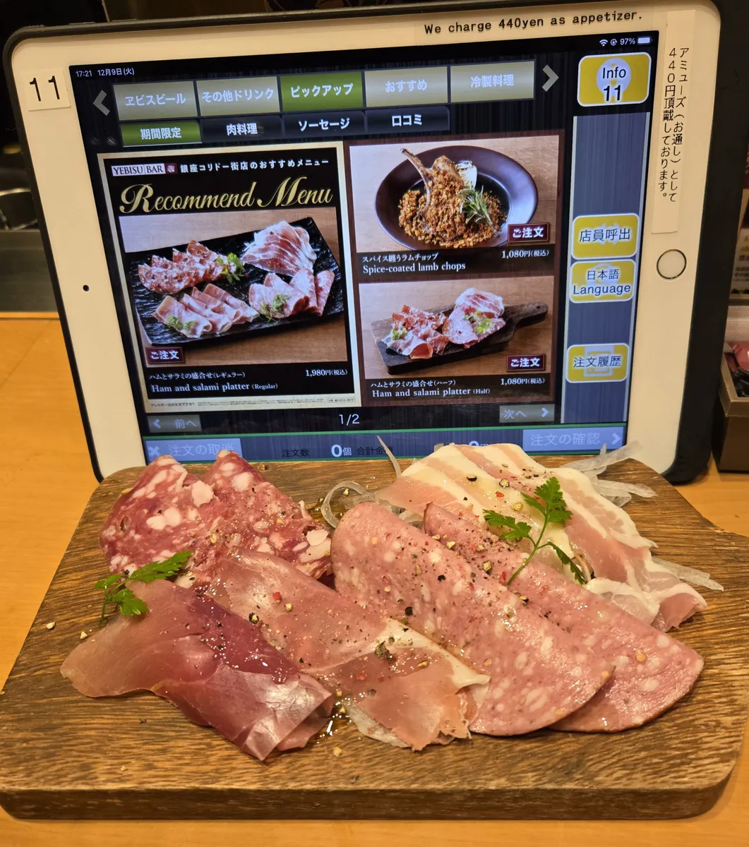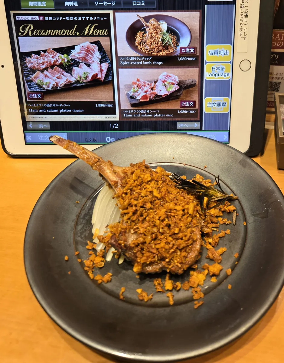 ヱビスバーアプリ月間ランキング特典利用でイベントメニューを1品。もう1品は普通に注文。