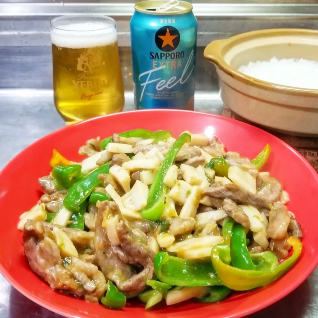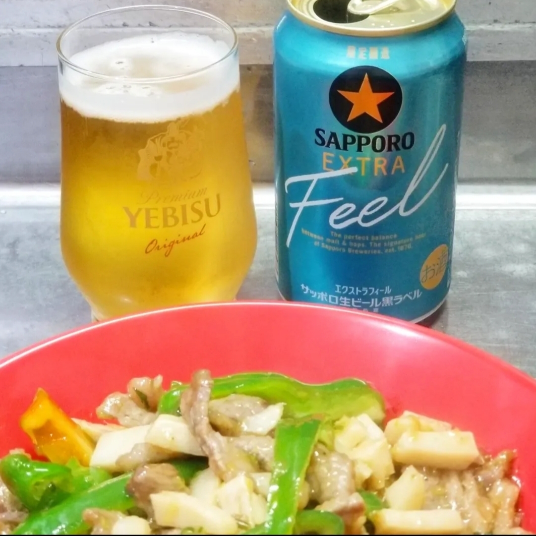 しっかりしたお味の青椒肉絲にEXTRA Feel、合いますね🍺✨
