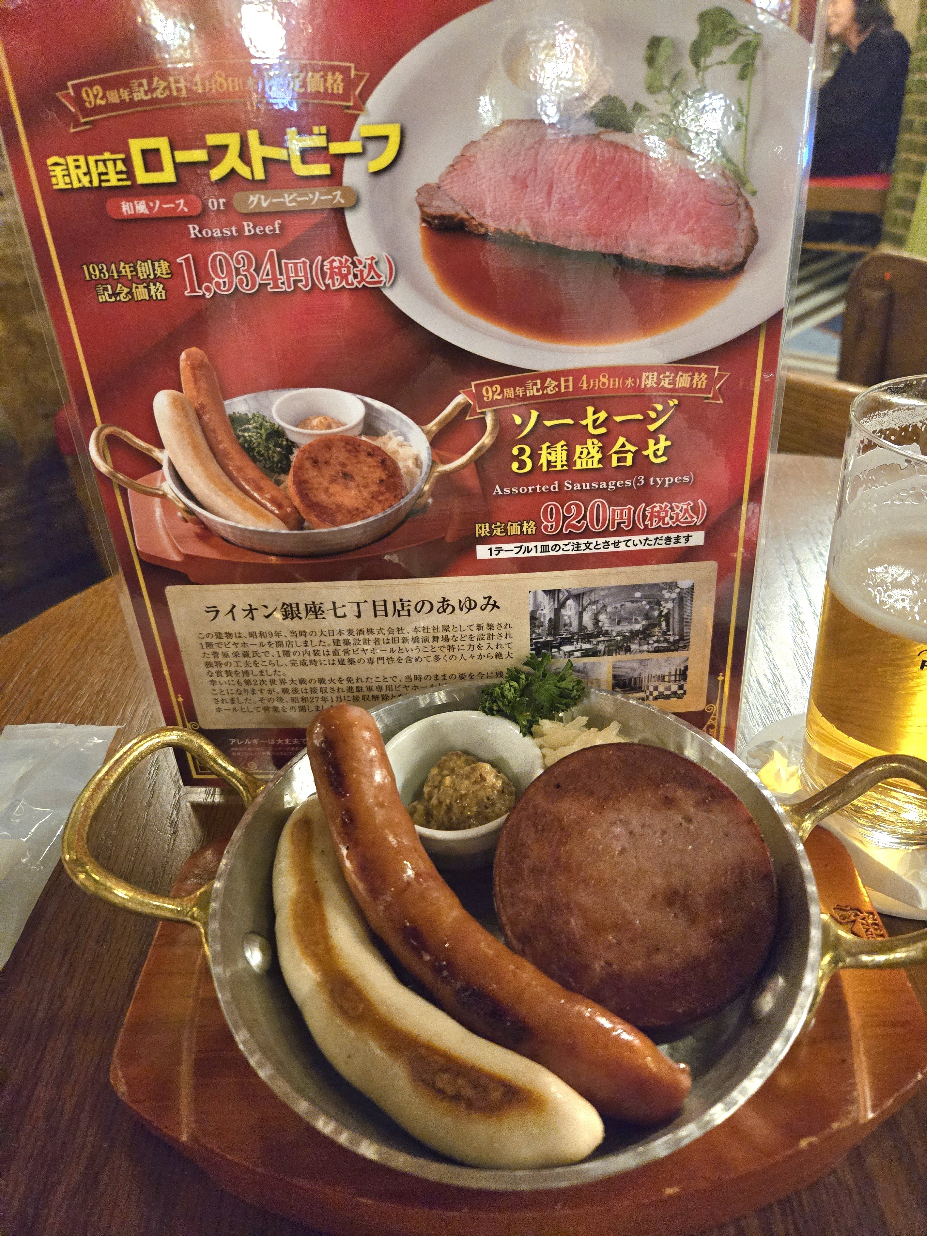 ビヤホールコンサートもあり、早い時間から大賑わいです😊通常税込2250円のローストビーフが創業年号の1934円🐮ソーセージ3種盛合せが通常2080円がなんと92周年価格の920円‼️