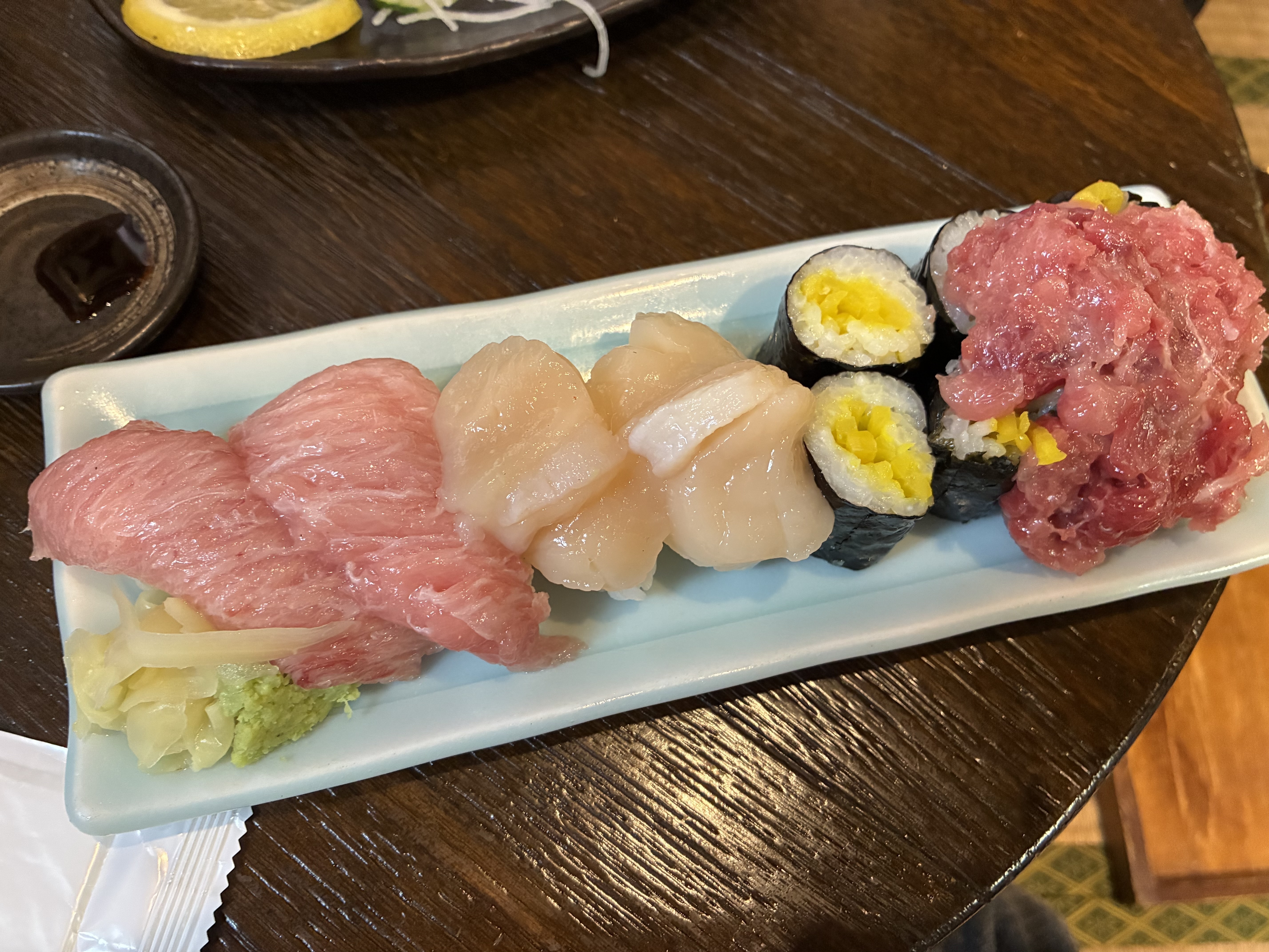 お寿司は本マグロカマトロ・北海道ホタテ貝柱・本まぐろたく巻き