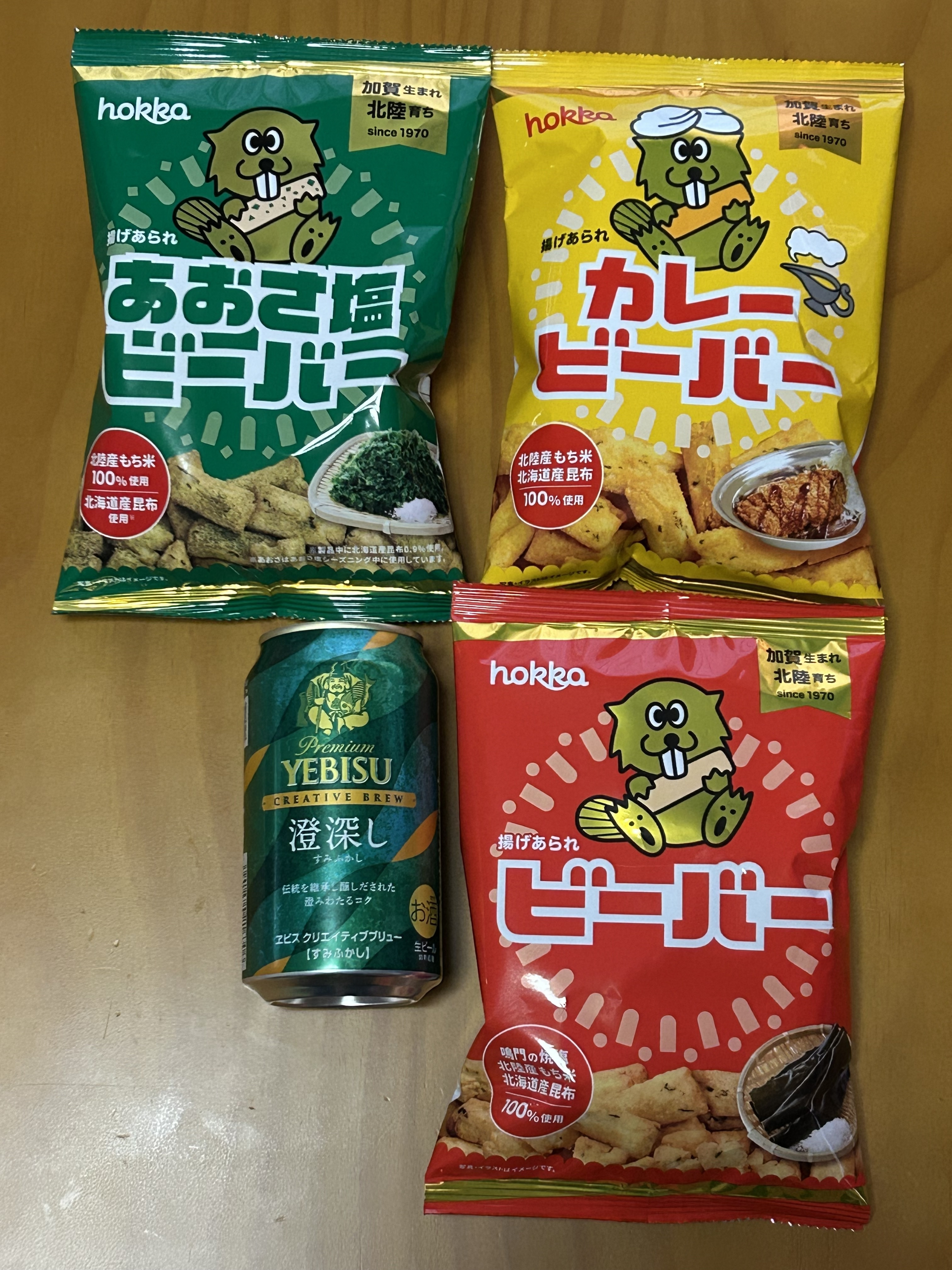 昨年12月に能登半島へ行った時に、YEBISUつよしさんに教えて貰った🦫ビーバーあられ、何と市内(岐阜県で夏に🥵暑い市)のリカーマンさんに売ってた‼️