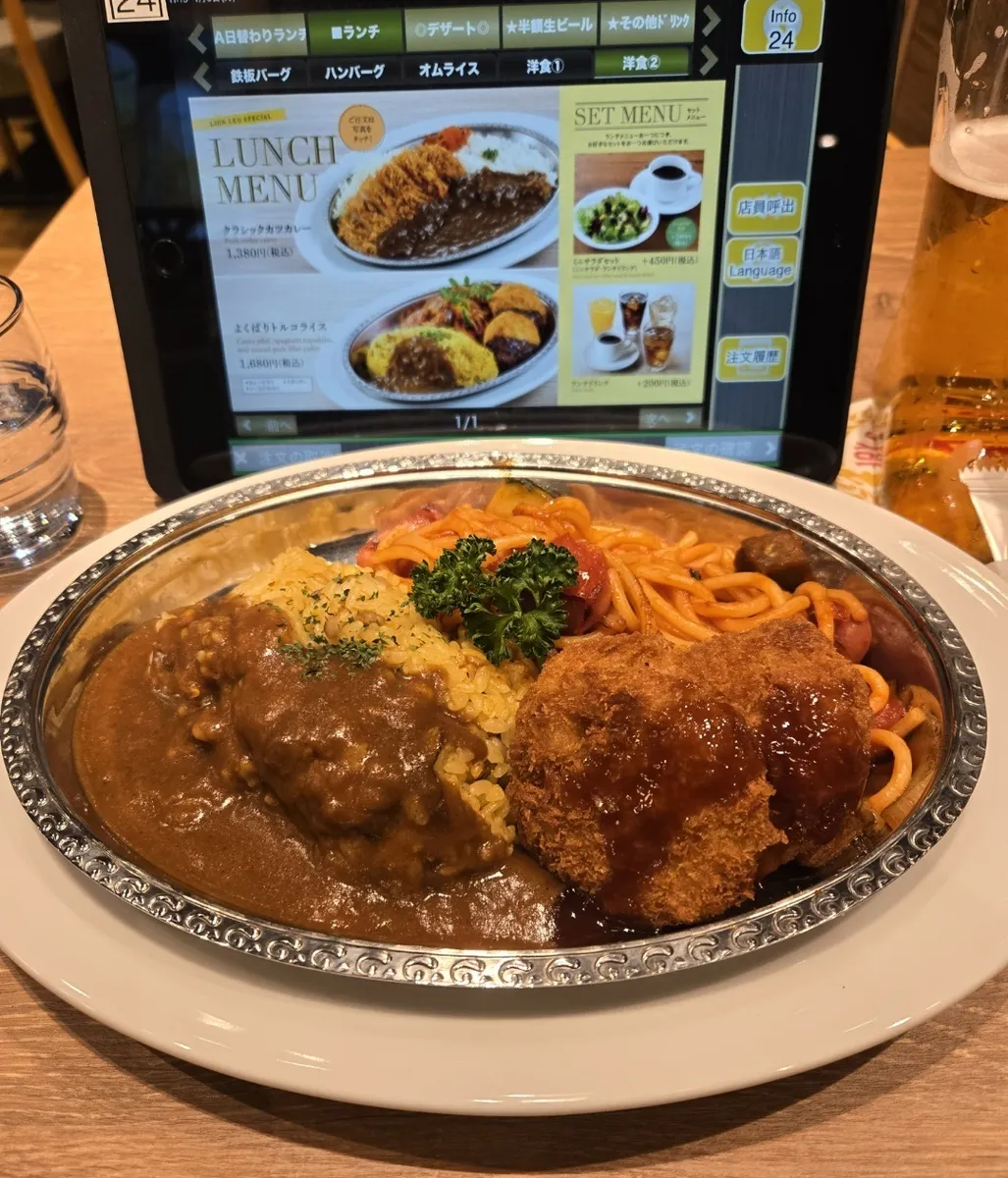 サッポロ黒ラベルブーツグラスから🍺日替りランチは大崎店限定みたいですが、よくばりトルコライスを注文。