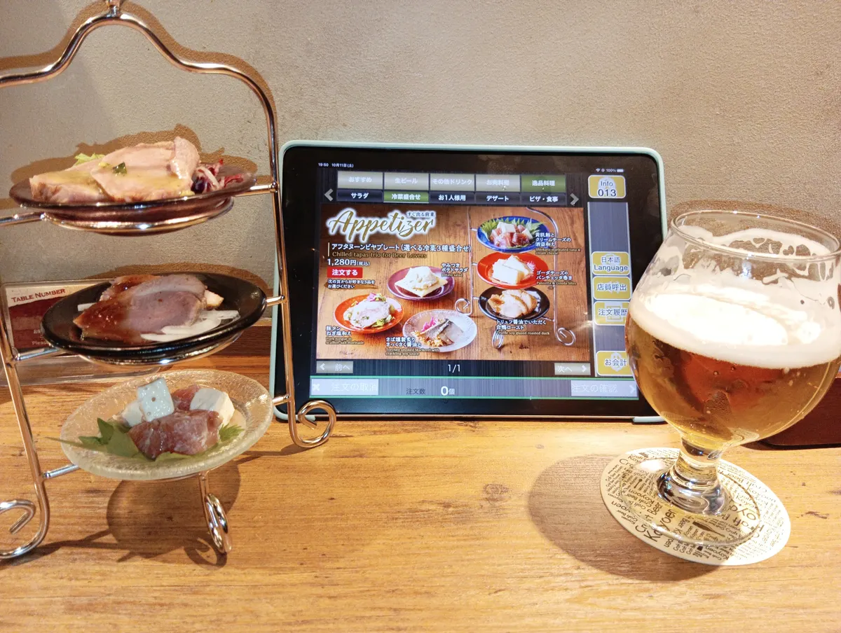 先ずは浩養園クラフトゴールデンエールとアフタヌーンビヤプレート(選べる冷菜3種盛合せ)を…!😋3種は黄肌鮪とクリームチーズの酒盗和え、トリュフ醤油でいただく合鴨ロースト、豚タンねぎ塩和えで…!😆