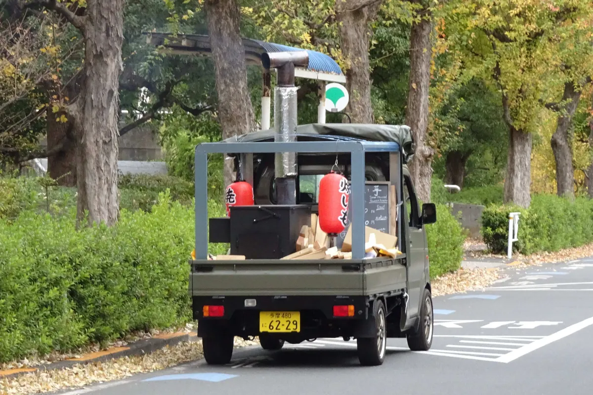 東京体育館そばの道を、焼き芋屋が煙を吐きながら走っていきました。