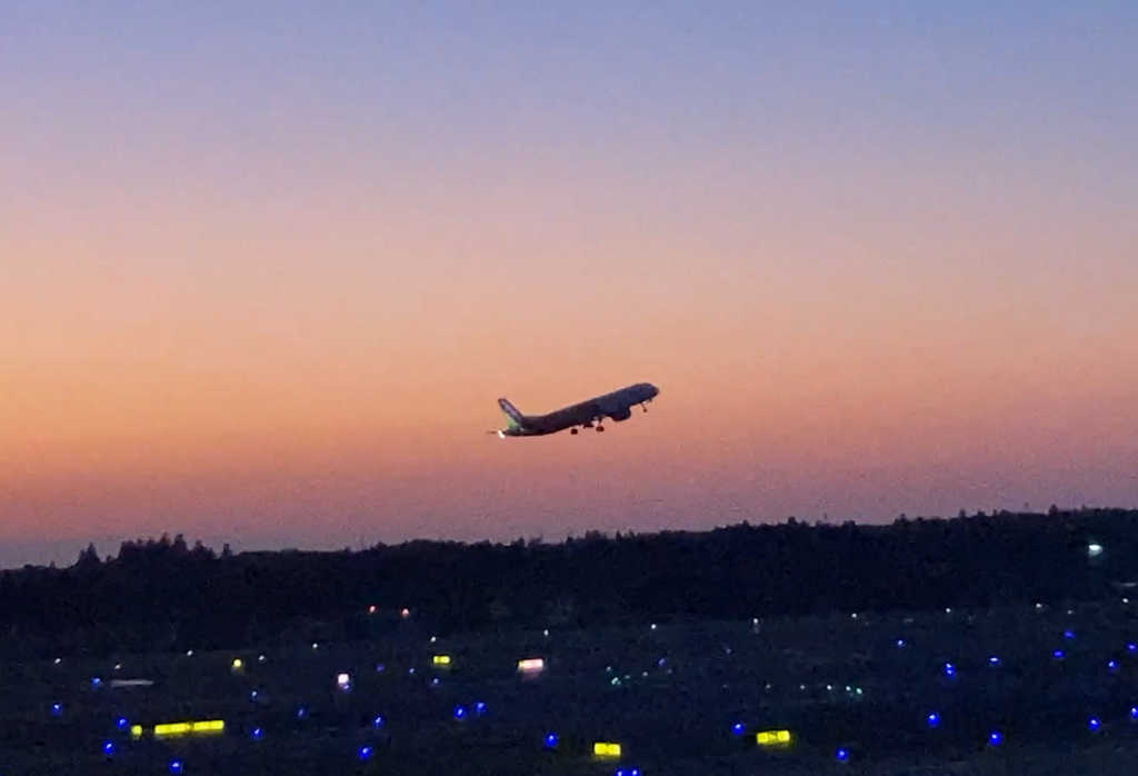 こっちは、同じ成田空港の展望デッキからのものですが、ちょっとだけ明るいですか? 飛び立った飛行機。スマホでしか撮影しないから、明るさが足りないのか ぼんやり してる気がします。飛行機を眺めるのは好きだけど、写真好きーでもないから、デジカメ欲しいとも思わず、きれいに撮れてたらいいなくらい。あぁ、もしかしたら何も考えずに ぼーっとするのが好き なのかも 笑