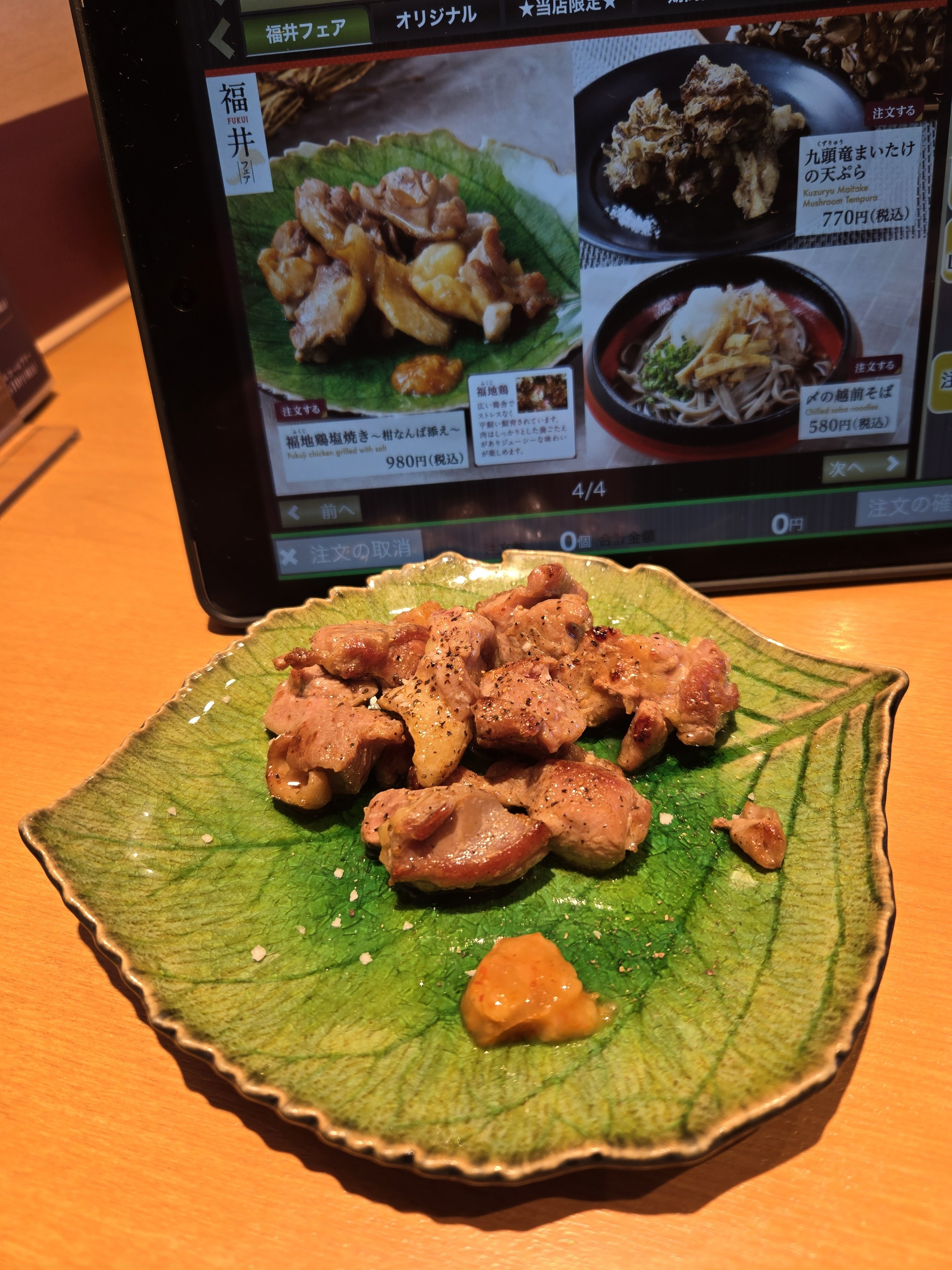 福地鶏は銘柄鶏❓タブレットの説明によりますと広い鶏舎でストレスなく平飼い飼育された鶏で肉はしっかりとした歯ごたえがあってジューシーらしい🤔