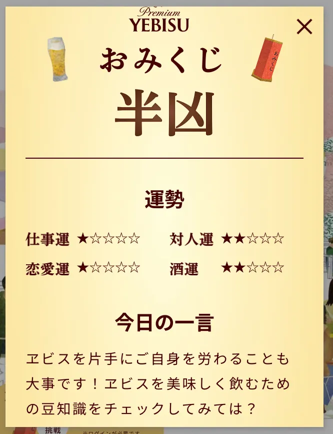 半凶でした。いや、運営さん、さすがにおかしくないですか? とうとう3割超えです。3日に一回が半凶というのは、さすがにちょっと気分が悪いです。明日のおみくじがどうか、楽しみではあります😊