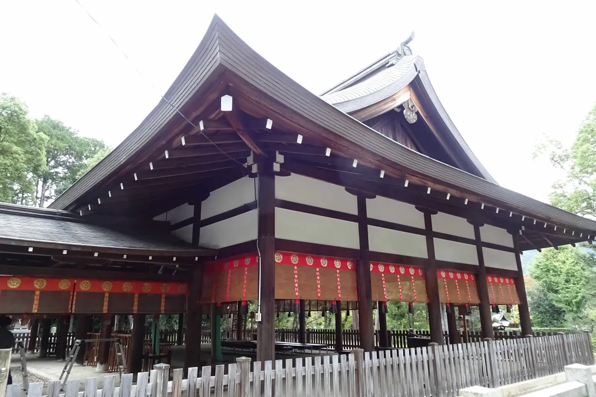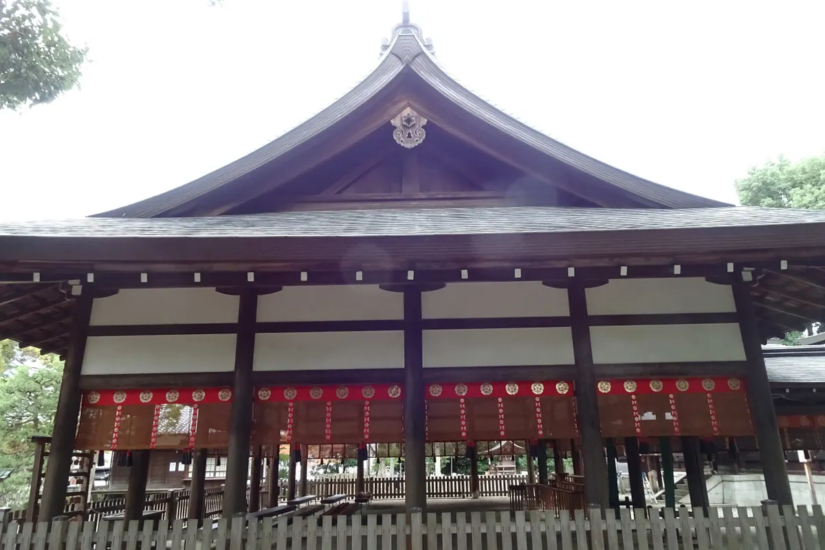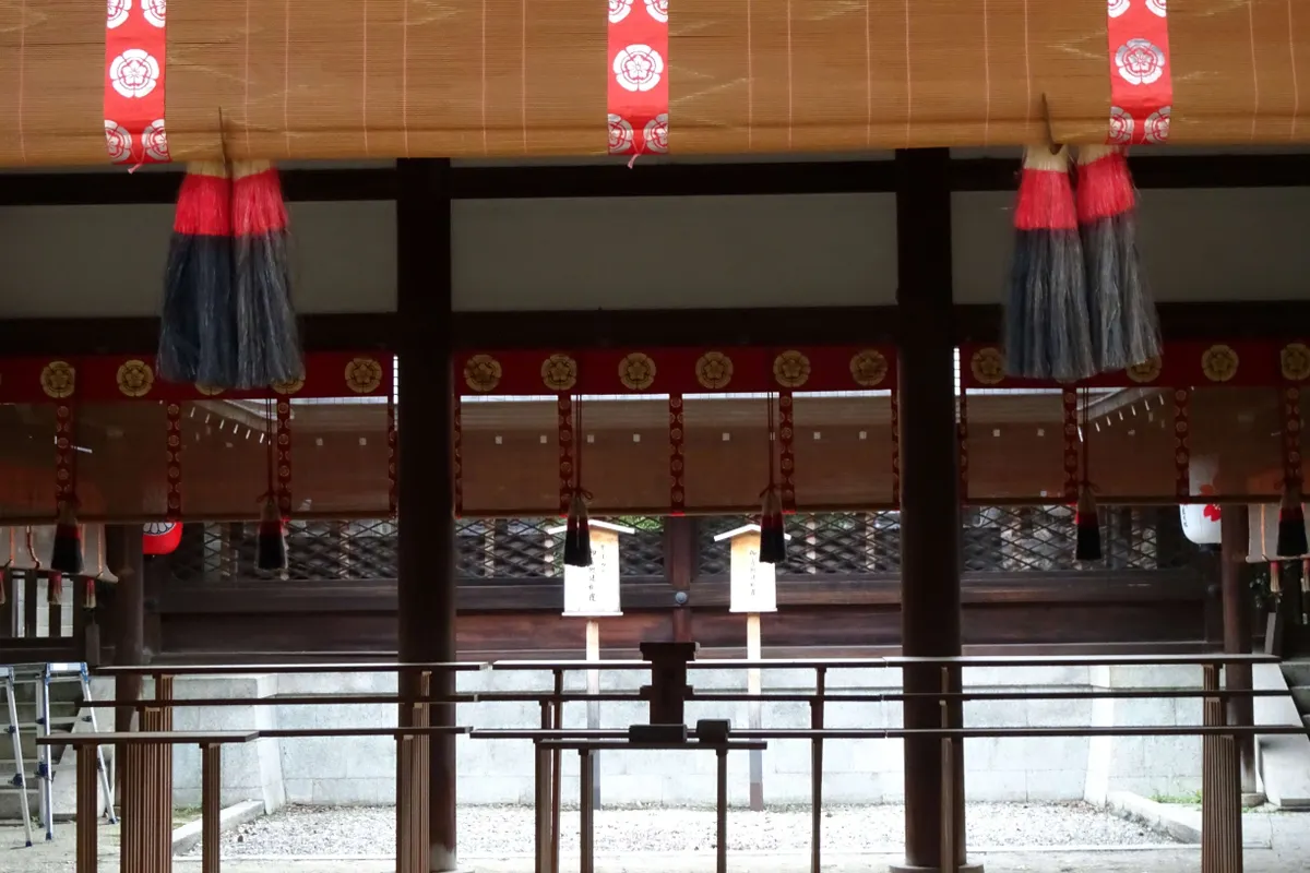 こちらの神社は左右に本殿があり、そのため拝殿はこのように横に長くなっています。
