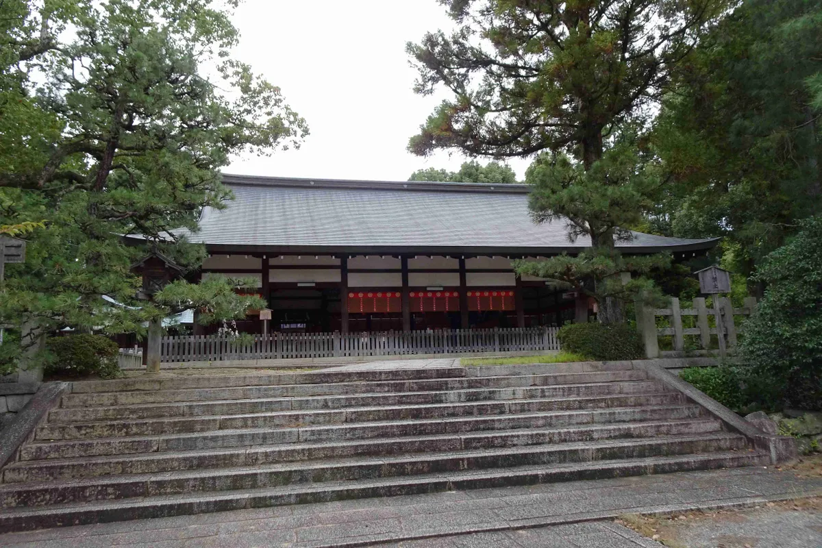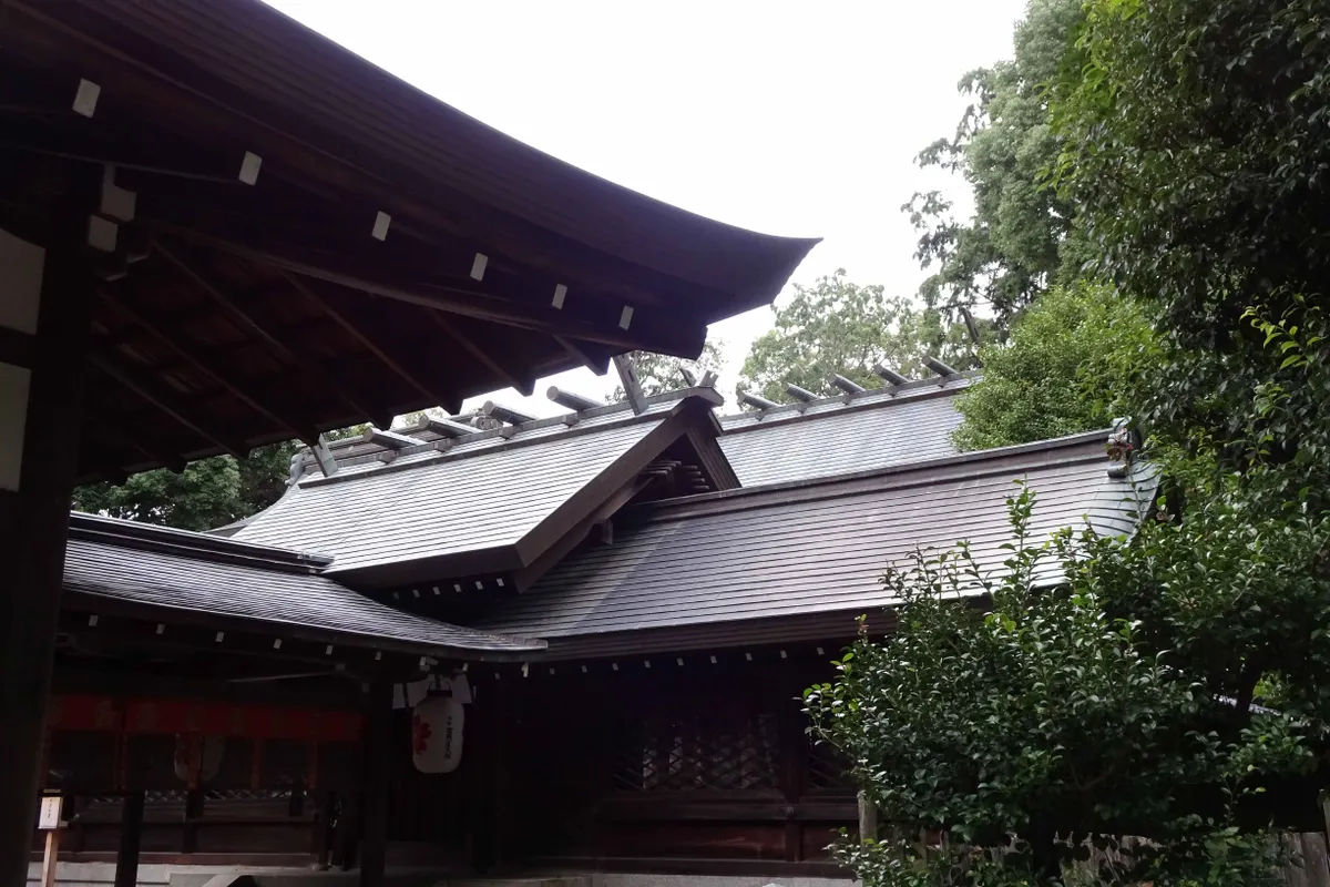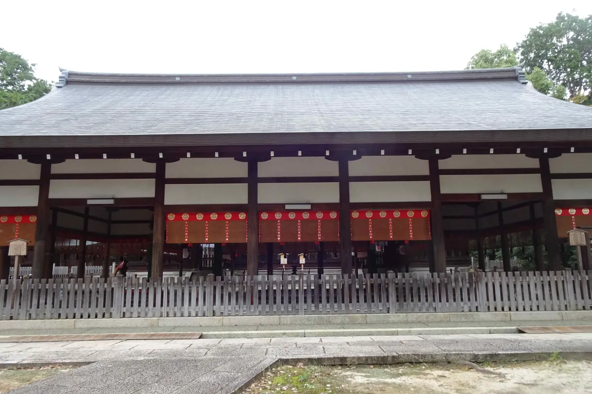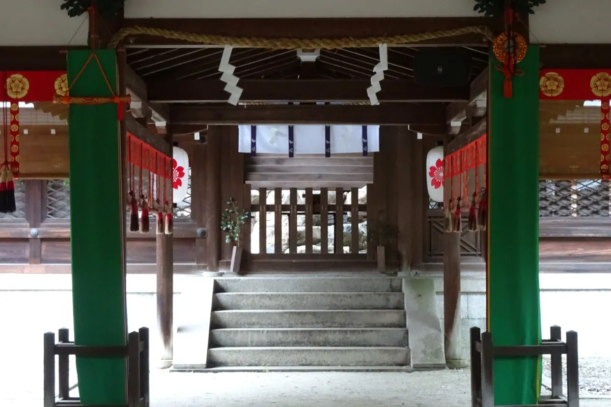 こちらの神社は左右に本殿があり、そのため拝殿はこのように横に長くなっています。