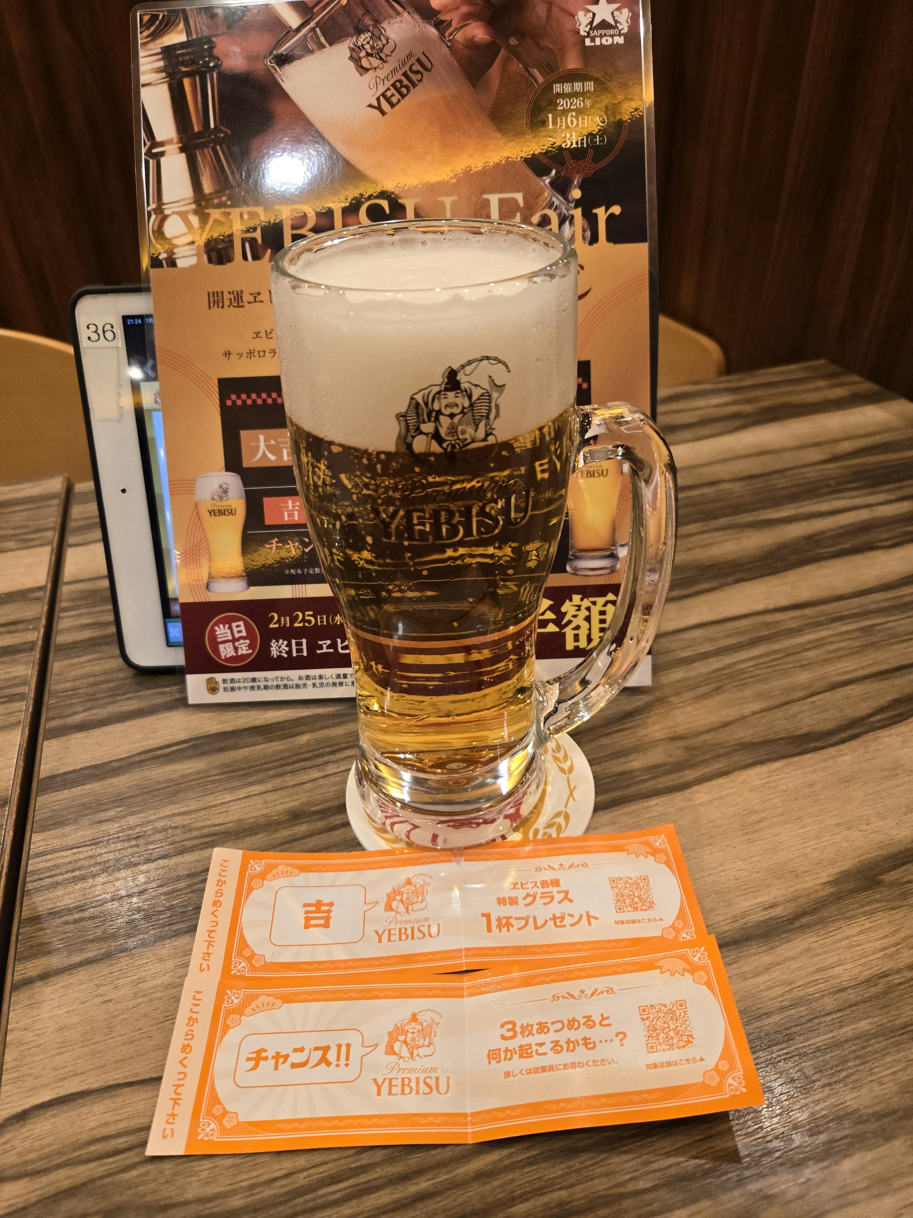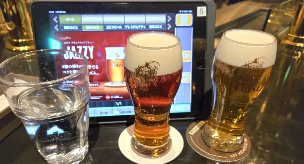 ヱビスバー上野店やグランスタ八重北店でスタッフさんによりますが、入店するとソフトドリンクのグラスでお水を用意してくれます。こちらのお店でも最近、タブレットで注文をする前にサッとお水を用意してくれるスタッフさんがいます😊いつもチェイサーかわりに水を飲んでいる姿を見てくれていたんだな🤔と思い感服しました😊