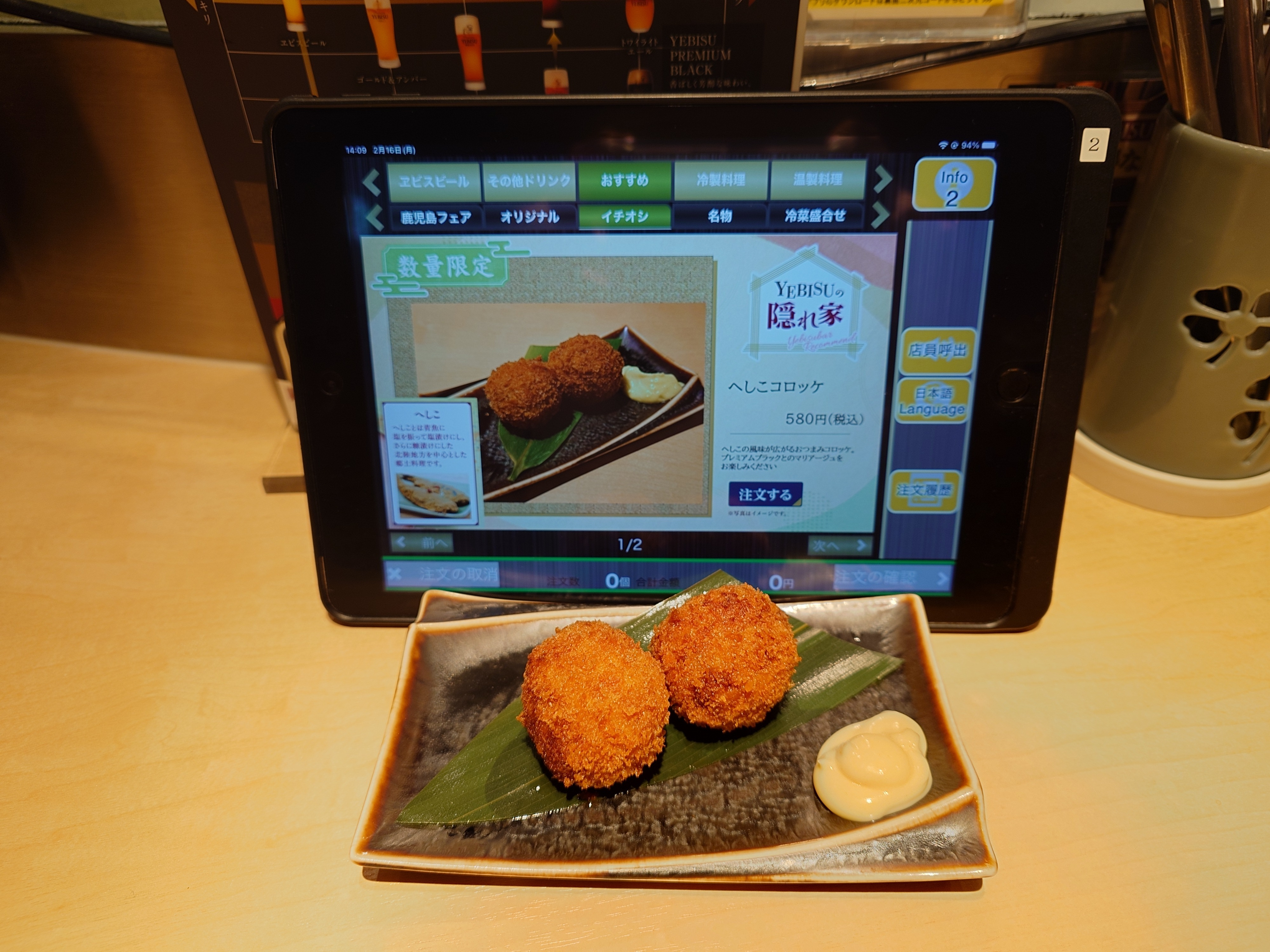 摘みが欲しくなった時に丁度ランチメニューからディナーメニューの切り替えとなり、各店舗限定メニューとなる「YEBISU の隠れ家」シリーズが提供されるとあって、迷わず注文した👍