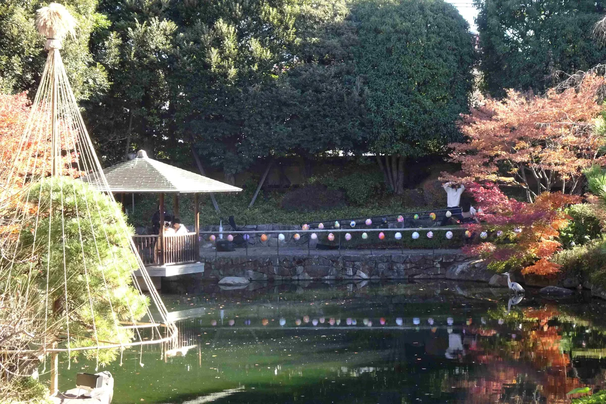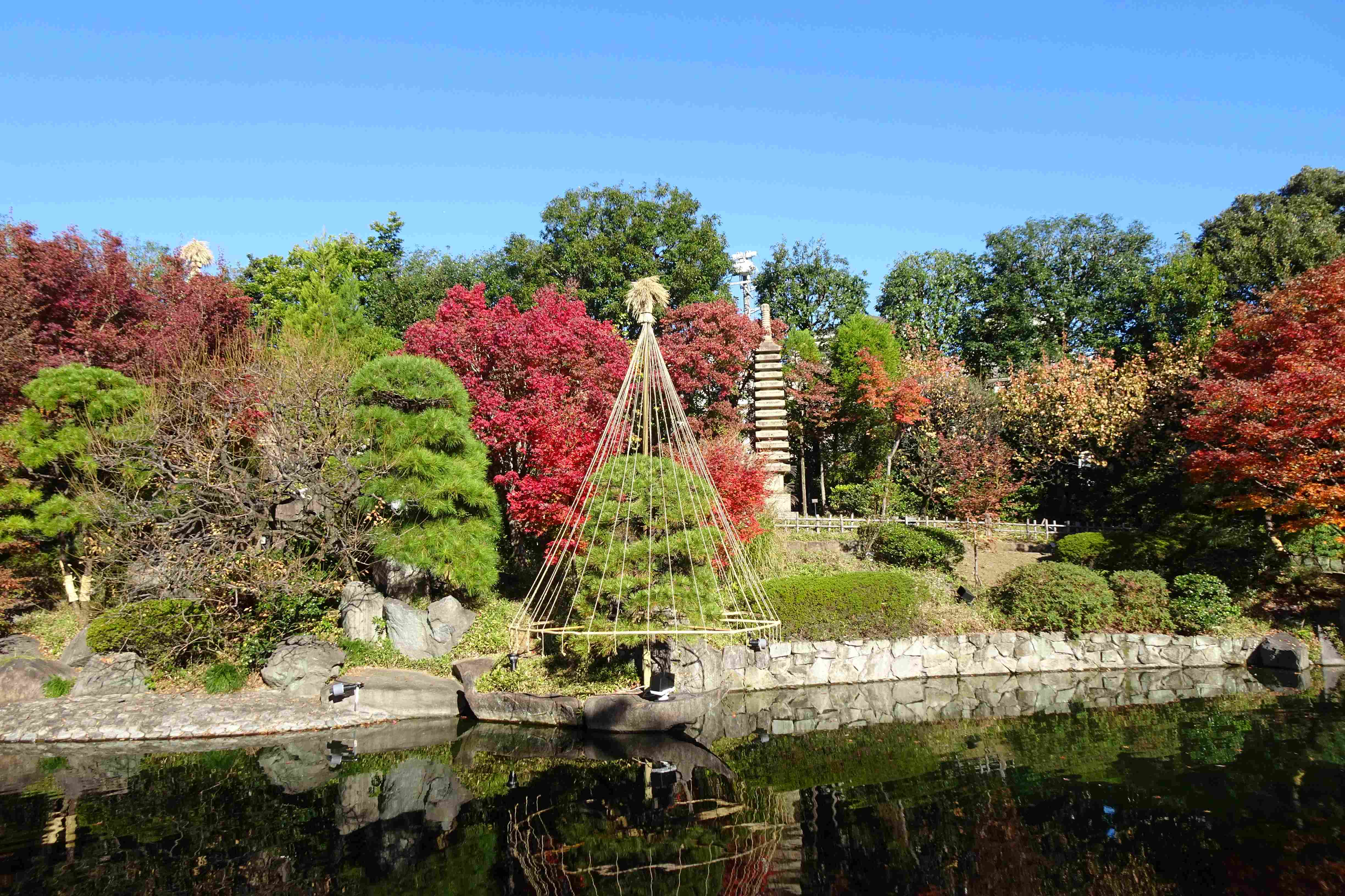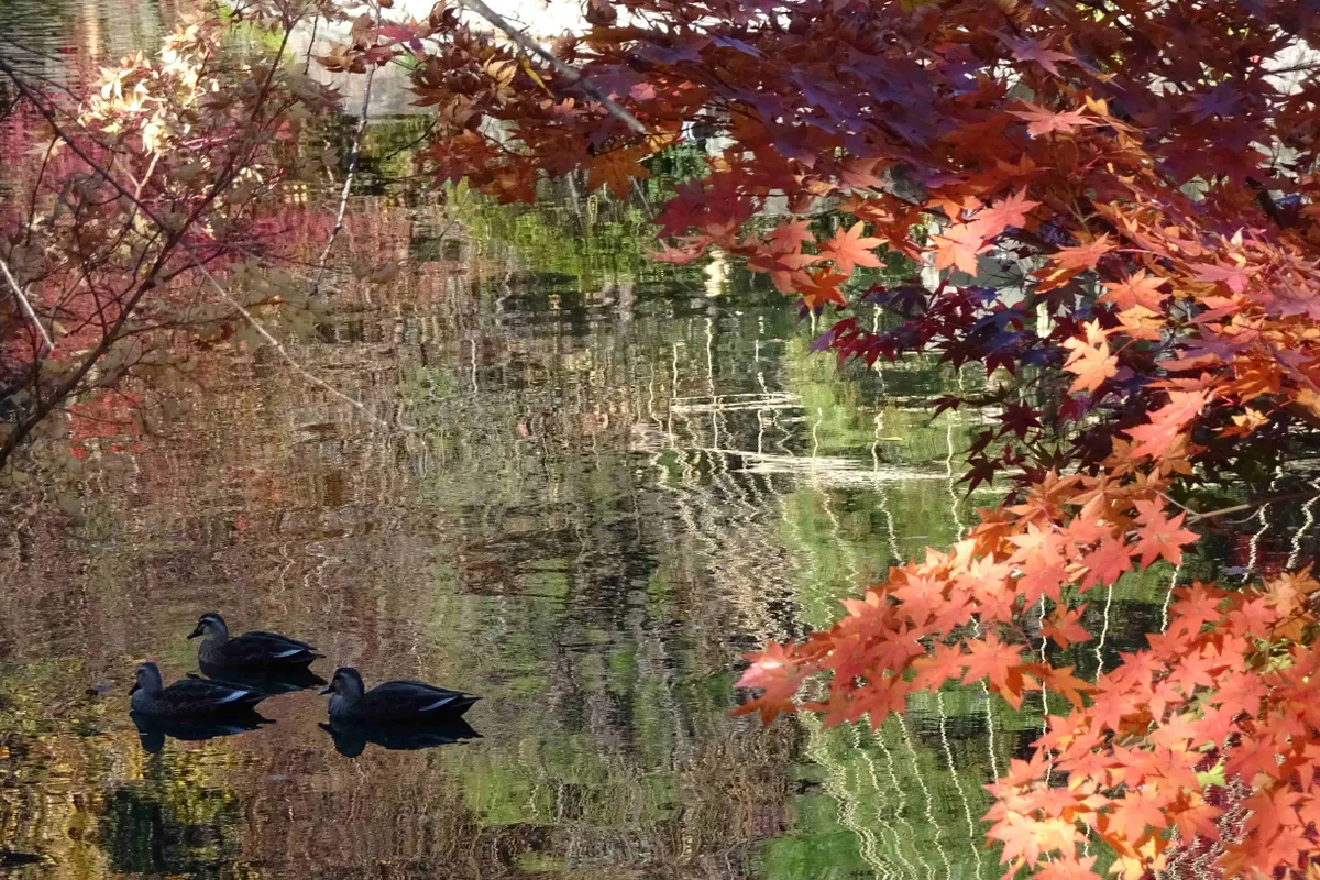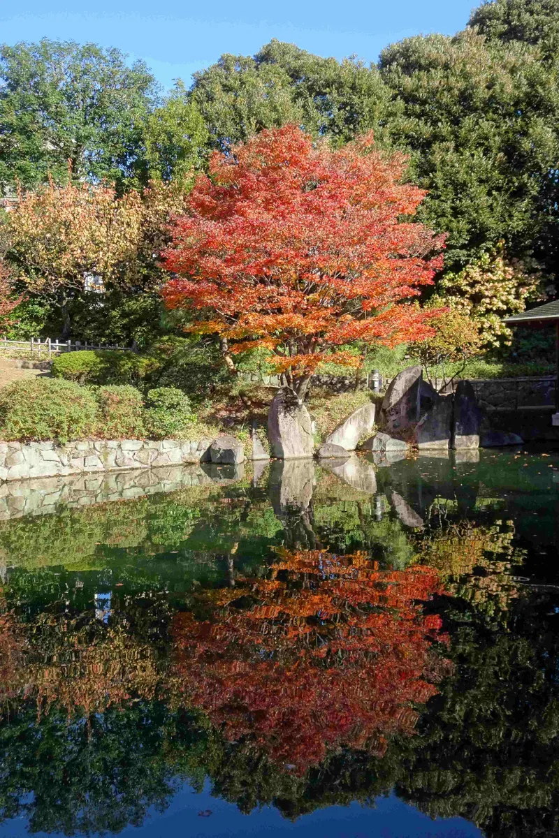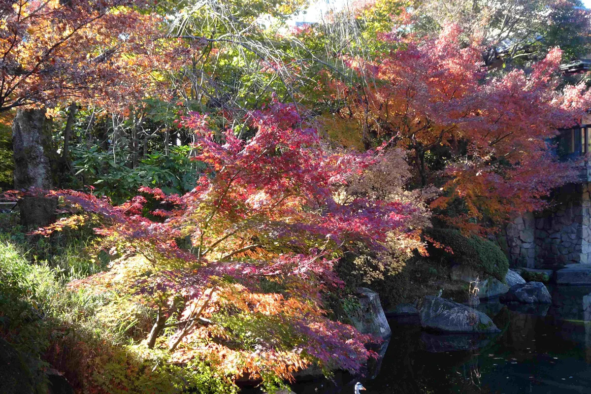 赤鳥庵の下から見た、池と紅葉の様子です。