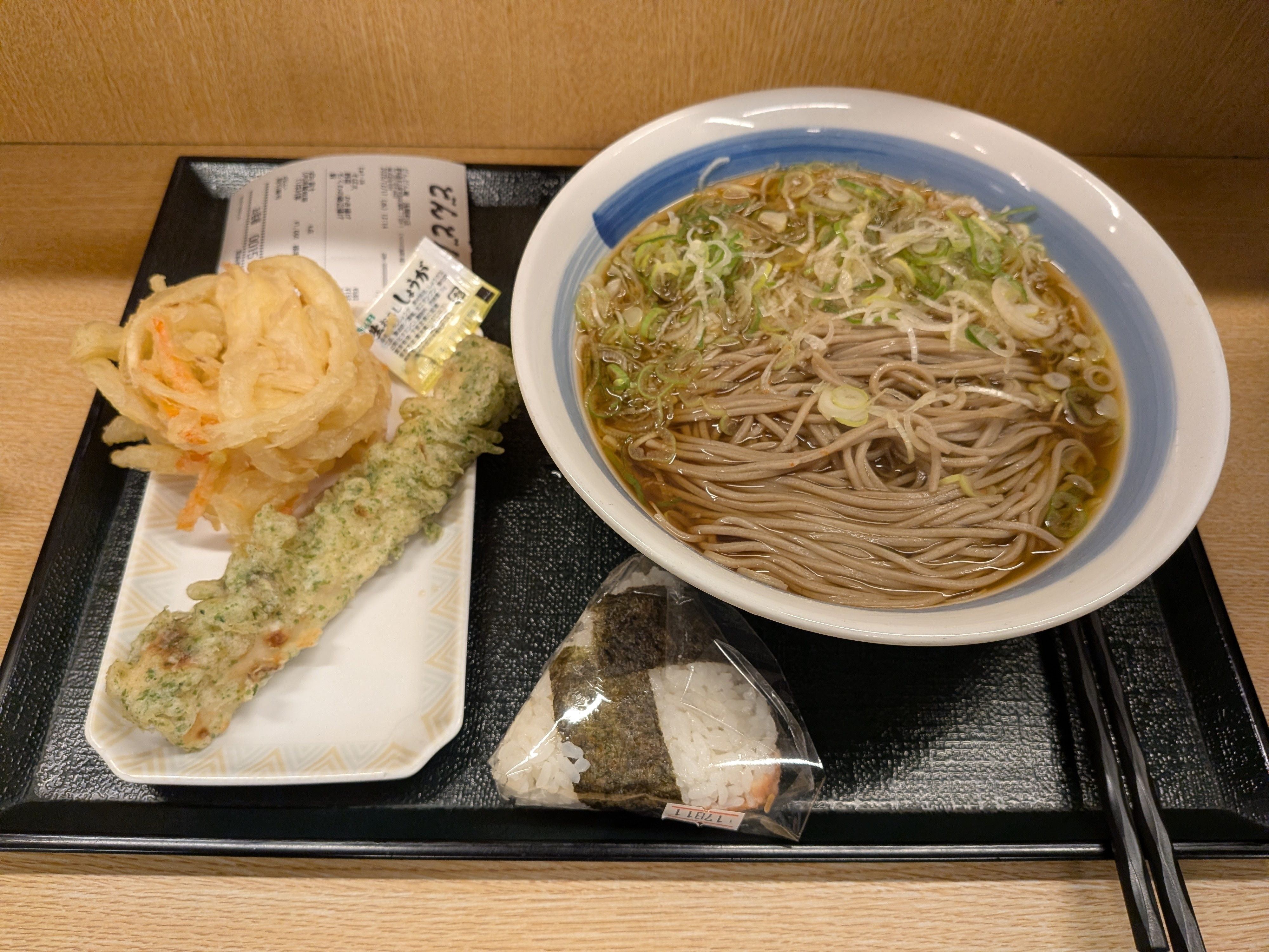 お昼休み、時間が無い!すぐ食べれるどんどん庵へ…!かけそばの大盛りとおにぎり鮭🍙とちくわ天、やさいかき揚げを1000円少し超えちゃった〜!😅