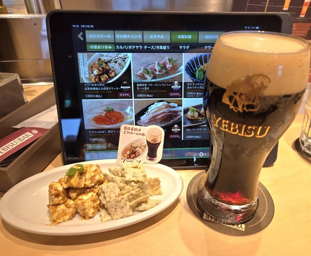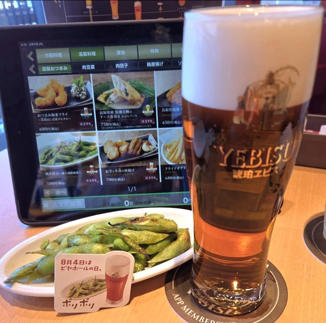 7枚目はヱビスバー、焼き枝豆と琥珀ヱビス🍺