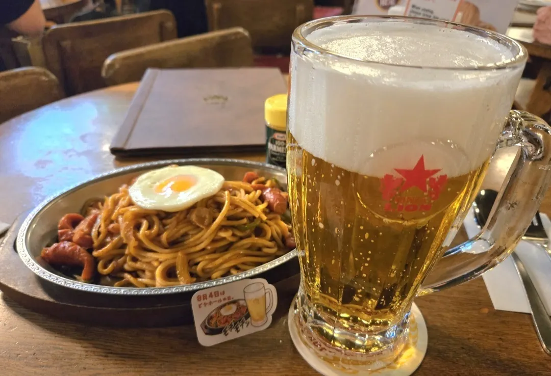 3枚目は銀座ライオン、ナポリタンとサッポロ黒ラベル特大ジョッキ🍺
