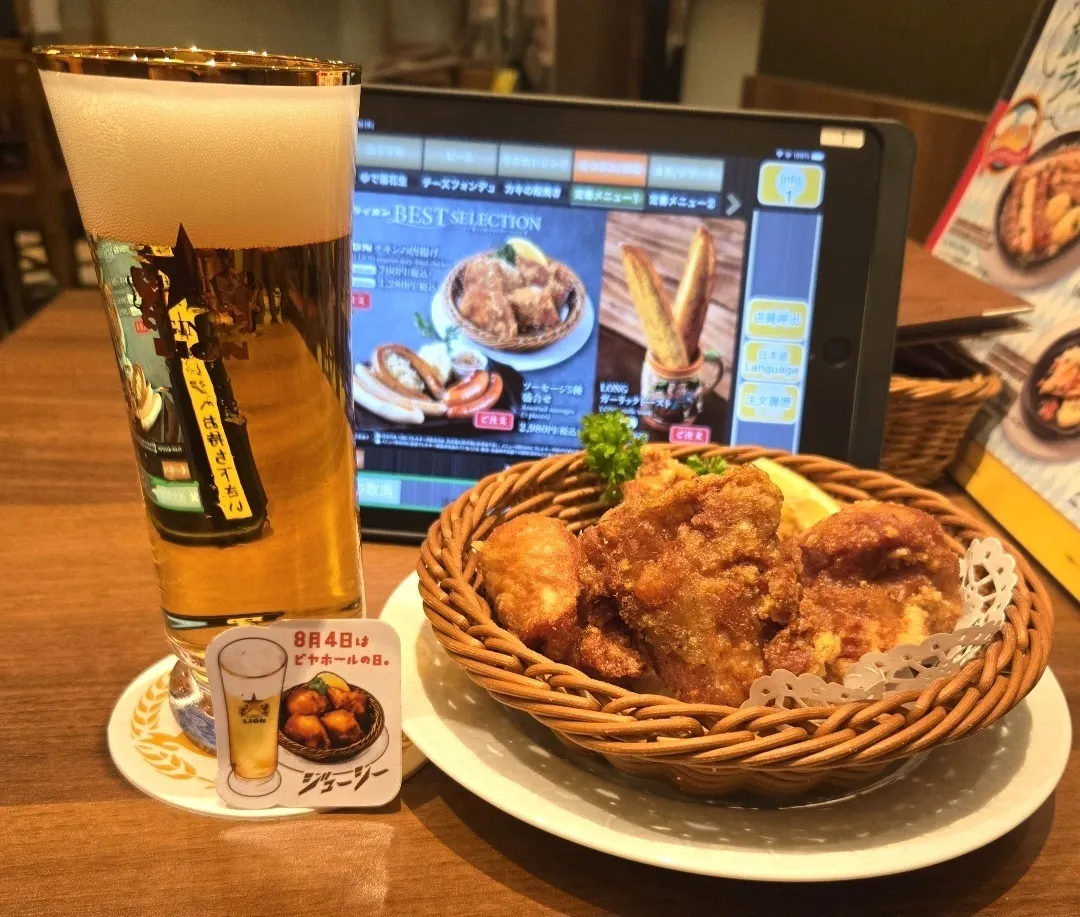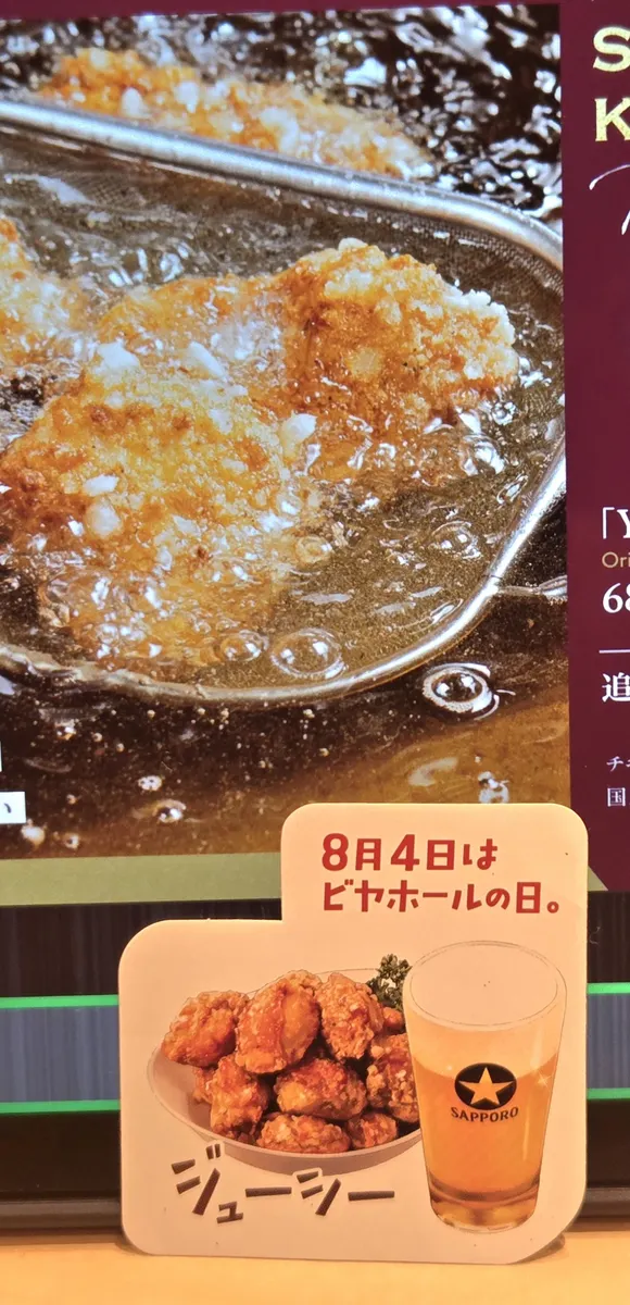 2枚目は銀座ライオン、鶏の唐揚げとサッポロ黒ラベル金口グラス🍺