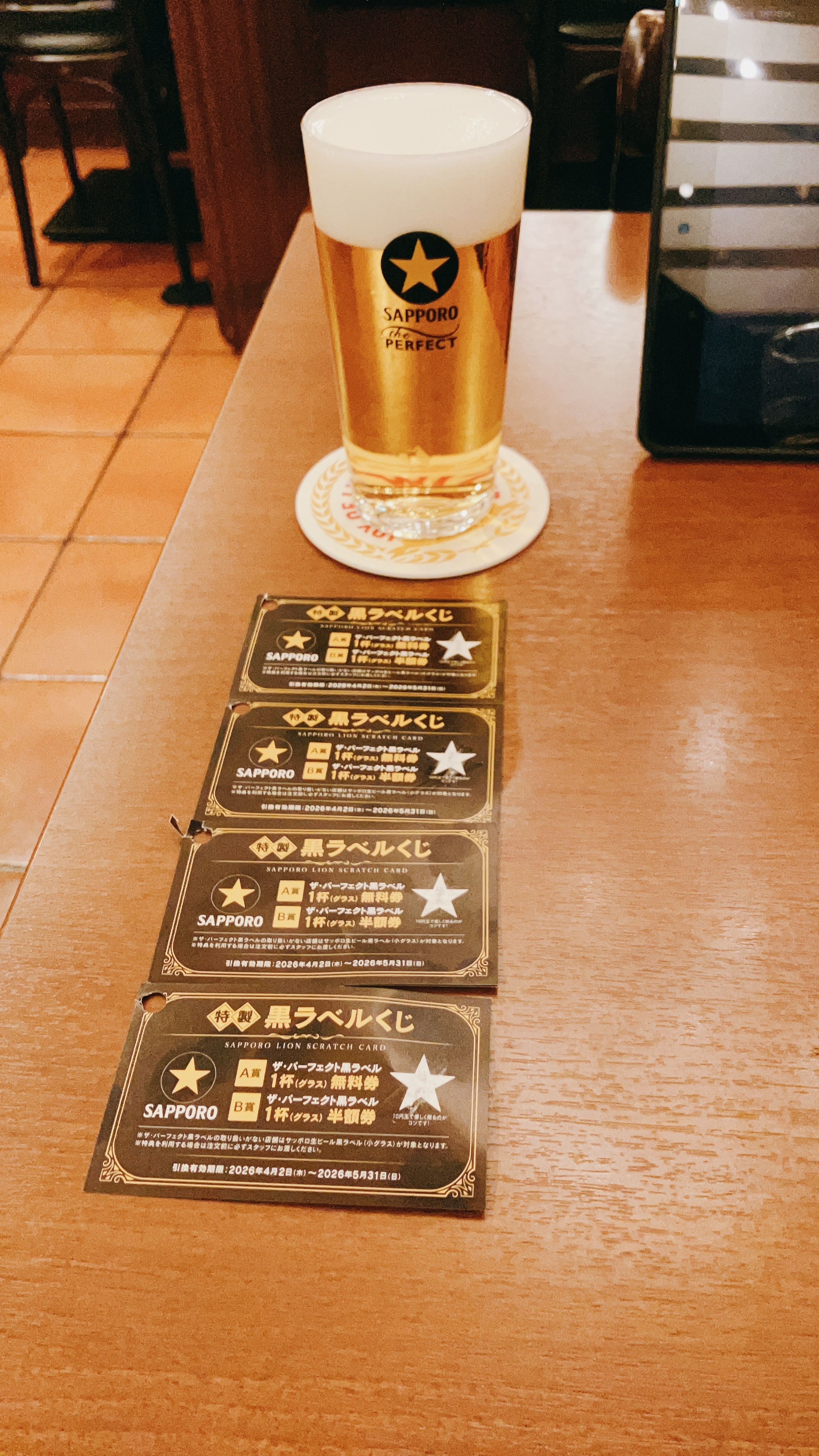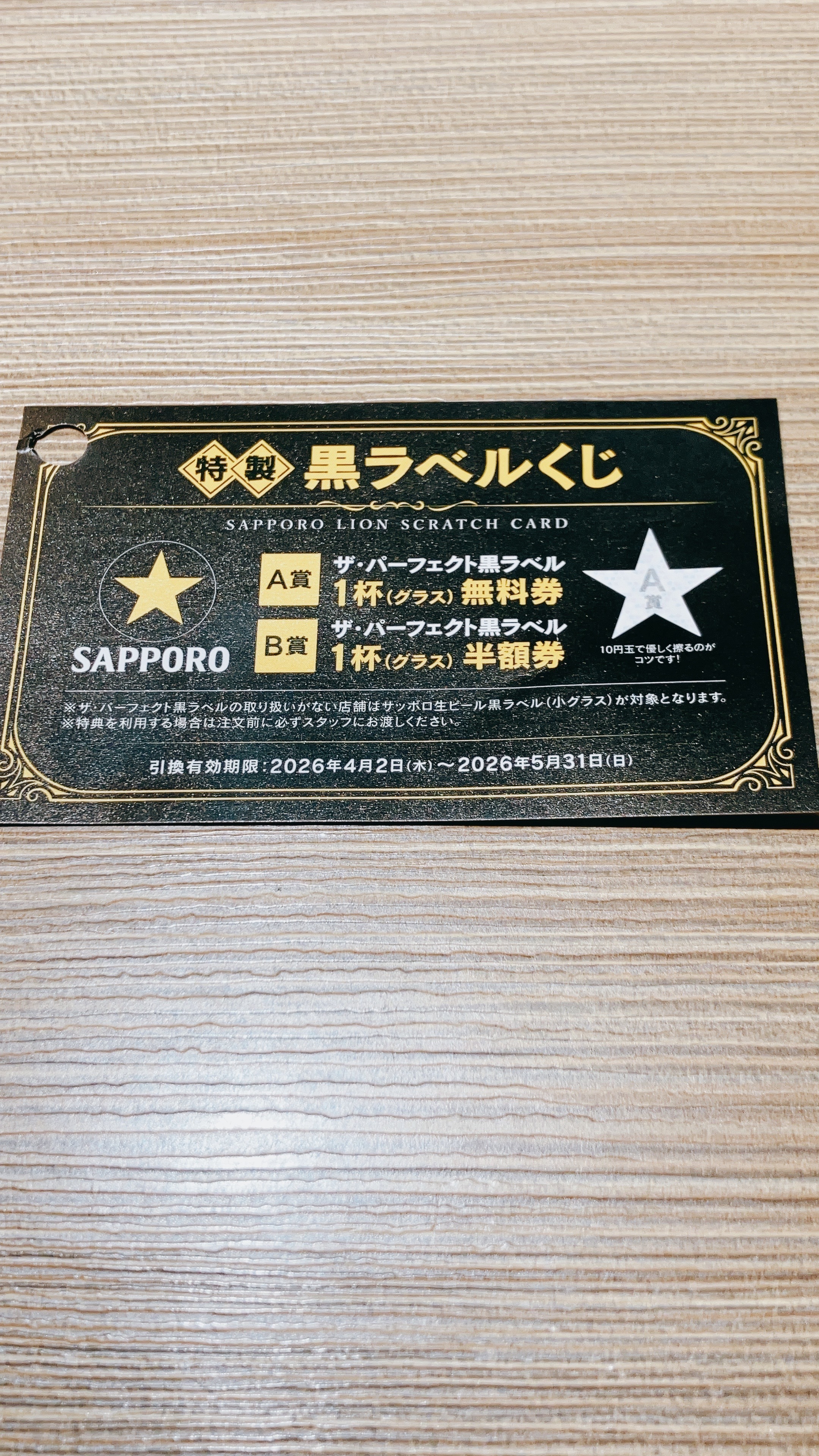 ✳︎クジ:ハズレ4枚、A賞(1杯無料)1枚
