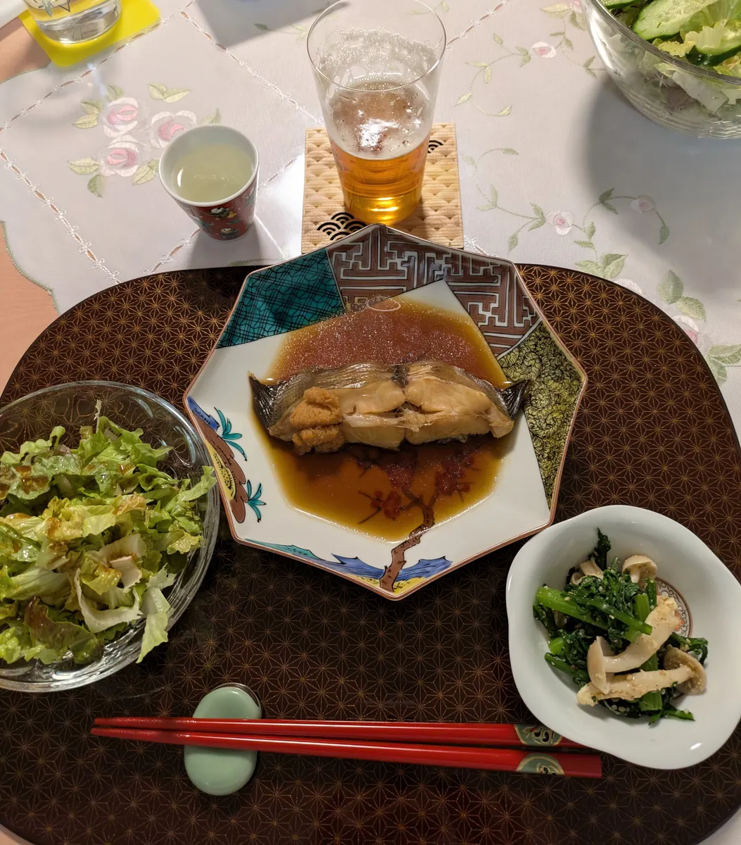 味染み染みの赤カレイの煮付け、春菊としめじの胡麻和え、グリーンサラダ、納豆と、今夜も美味しそうです😋
