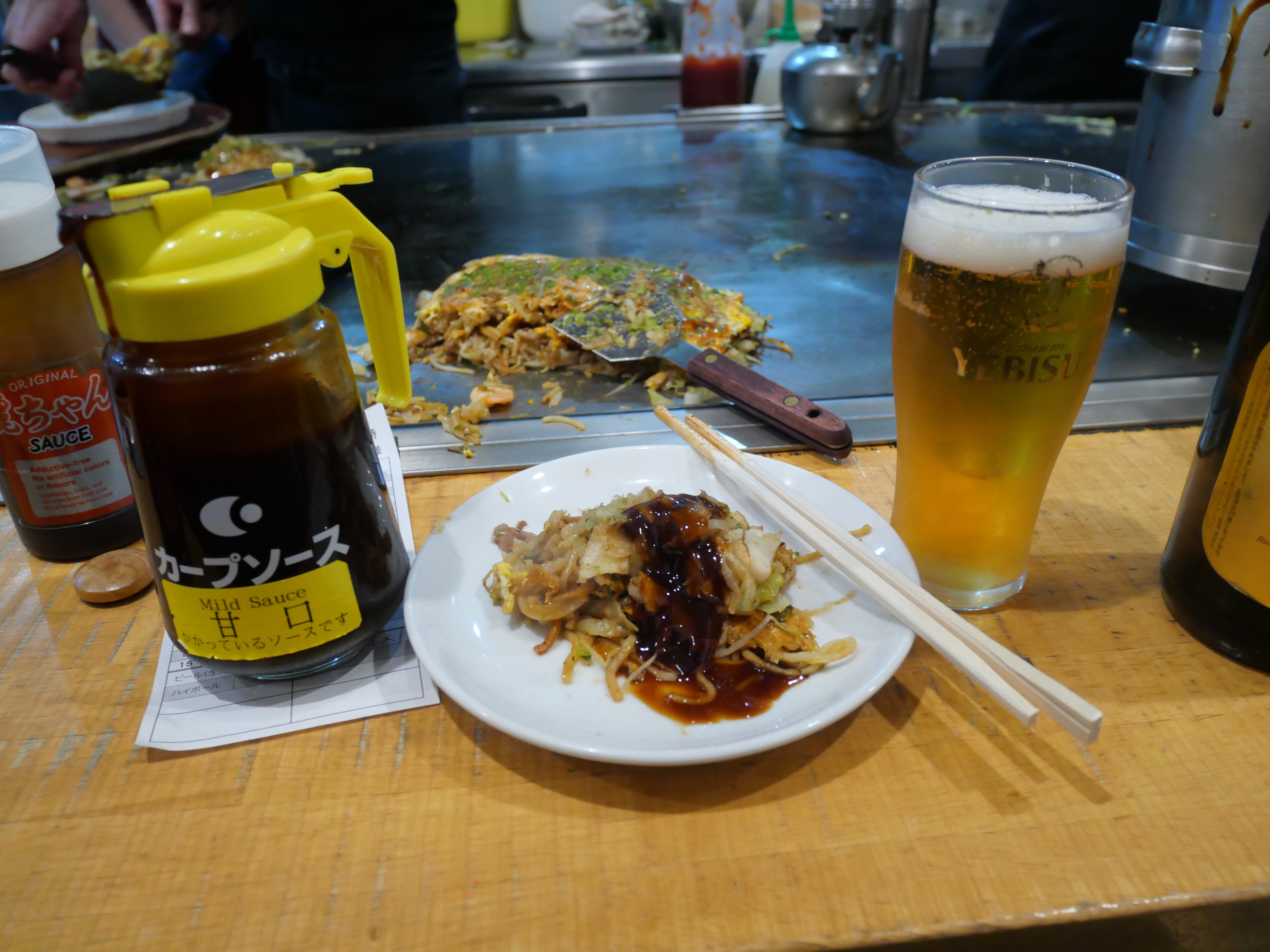 目の前の鉄板で焼きたてのお好み焼きをヱビスと共にいただく。