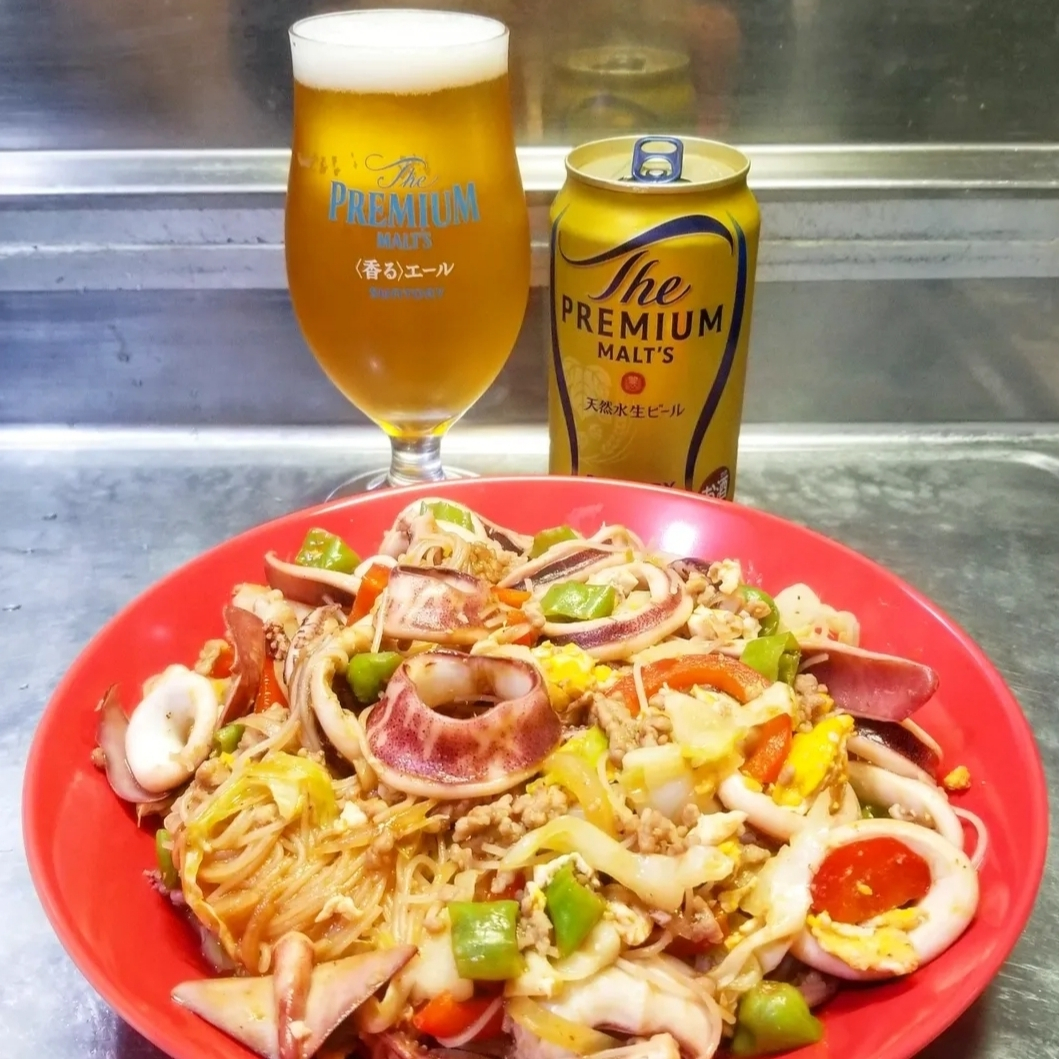 投稿を表示焼きビーフンには見えないくらい豪華な焼きビーフンですよね。イカがいい感じで美味しそうですね😎👍👏👏👏。