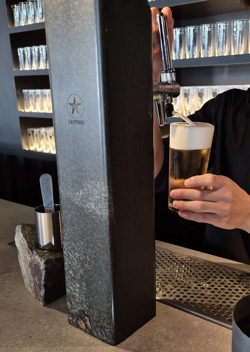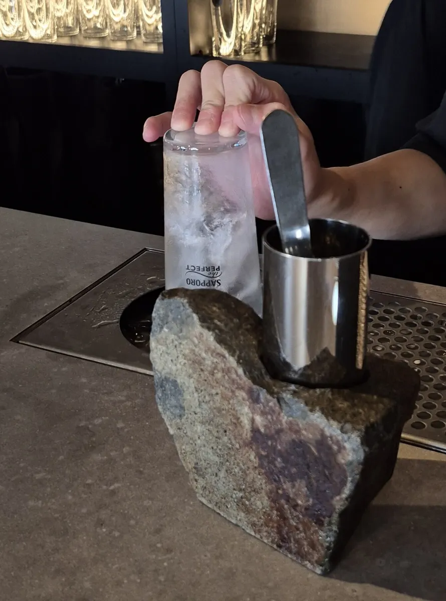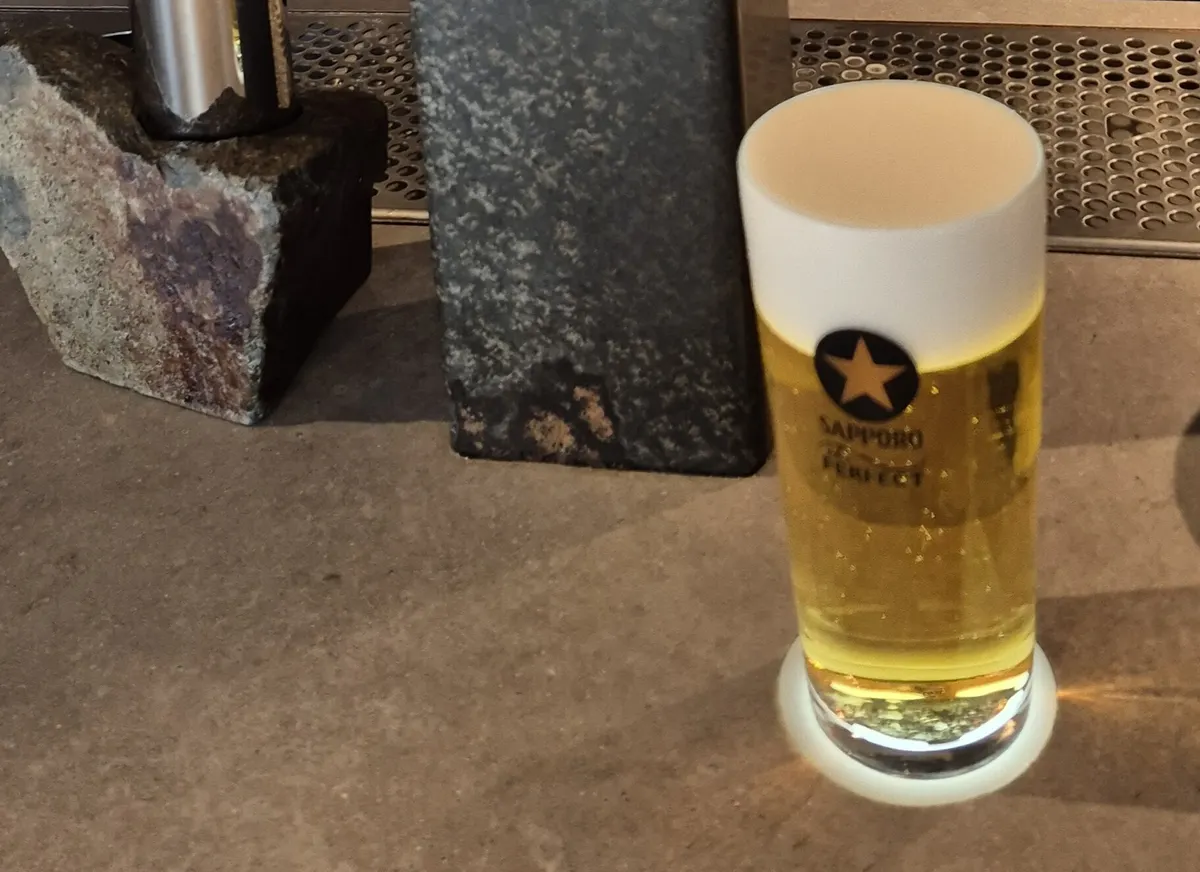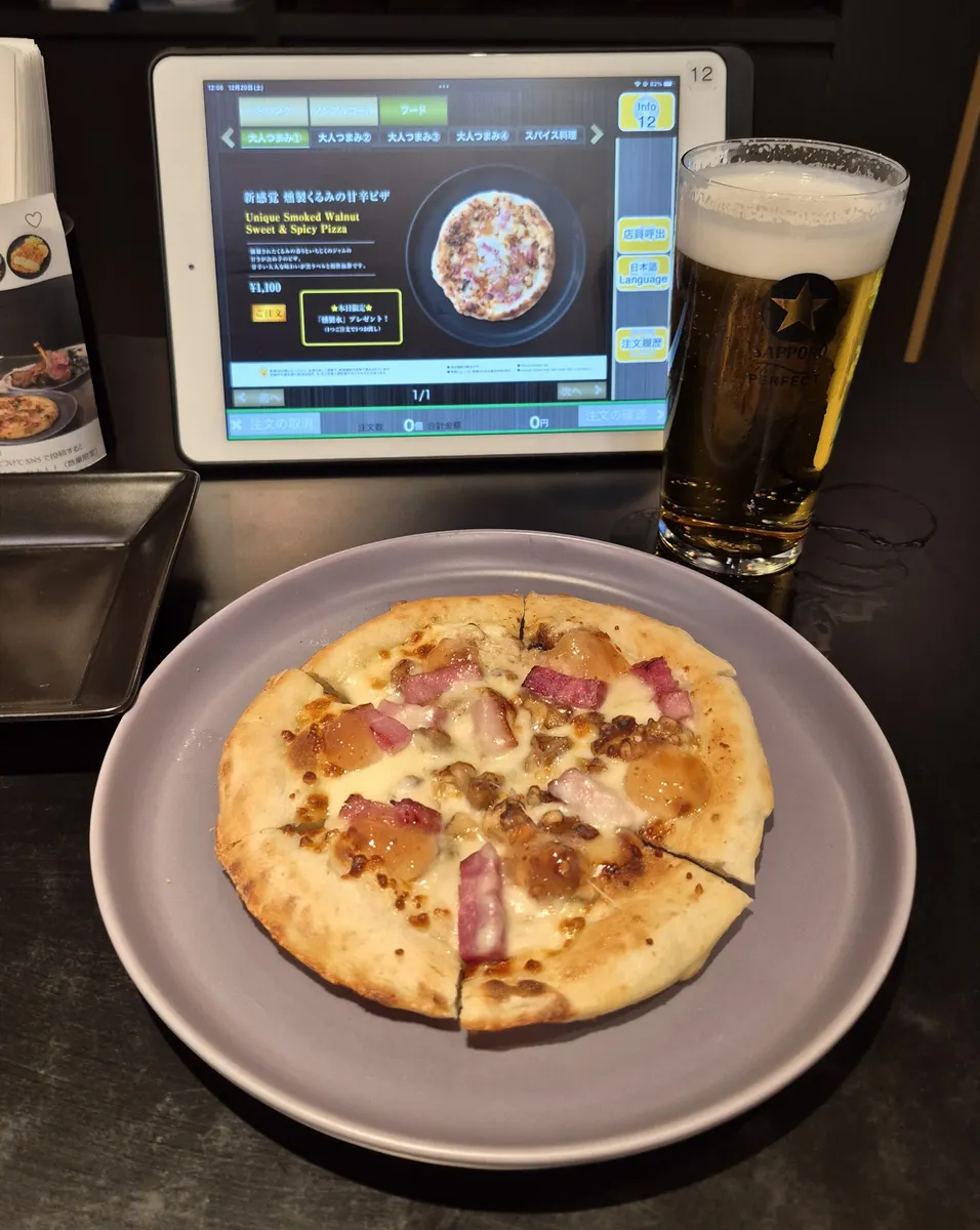 投稿を表示私もザ・パーフェクト黒ラベルベースにて、燻製くるみの甘辛ピザを注文しまして「燻製水」いただきました🎵