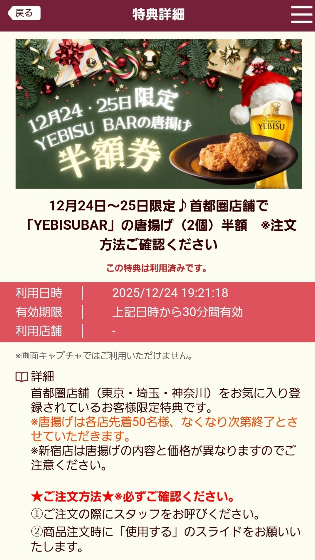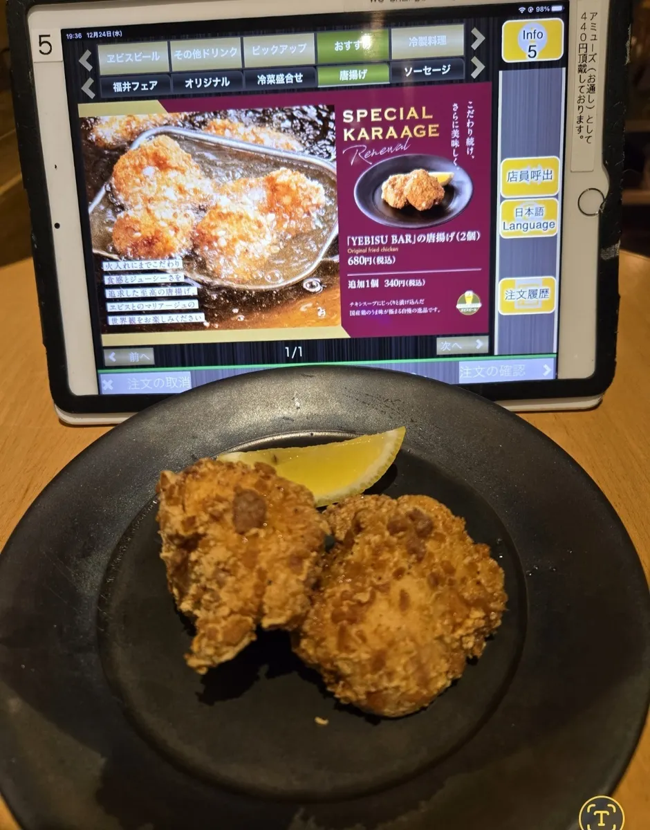 ヱビスバーアプリクリスマスプレゼント🎄🎁唐揚げ半額クーポン340円の為に、アミューズ(お通し)440円を払う男😅