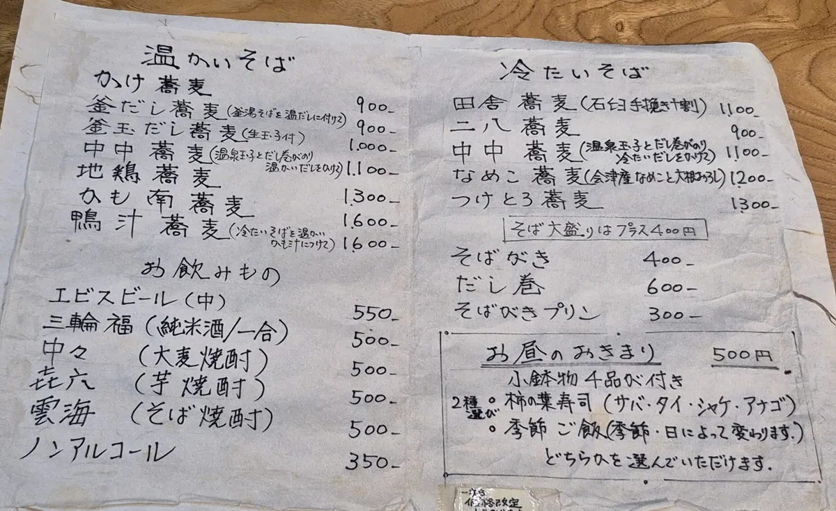 今回は,妻と2人で利用♪︎~。13:00頃到着し,先客が2組程おりましたが,着席してから数分で,後からのお客様で満席になり,数組の待ちも出ました。人気店です。お昼のおきまりの柿の葉寿司もしゃけが2個しか残っておらず…。最後の柿の葉寿司を私が頂き,妻が季節の御飯を頂きました。…ですが,私達が食べ終わる頃には,季節の御飯も売り切れて,蕎麦も田舎蕎麦(十割蕎麦)しか残っておらず,ニ八蕎麦は売り切れてしまいました。しかし,売り切れる前に入店出来て良かったです。実際,めちゃくちゃ旨いですし,売り切れるのも当然ですね。