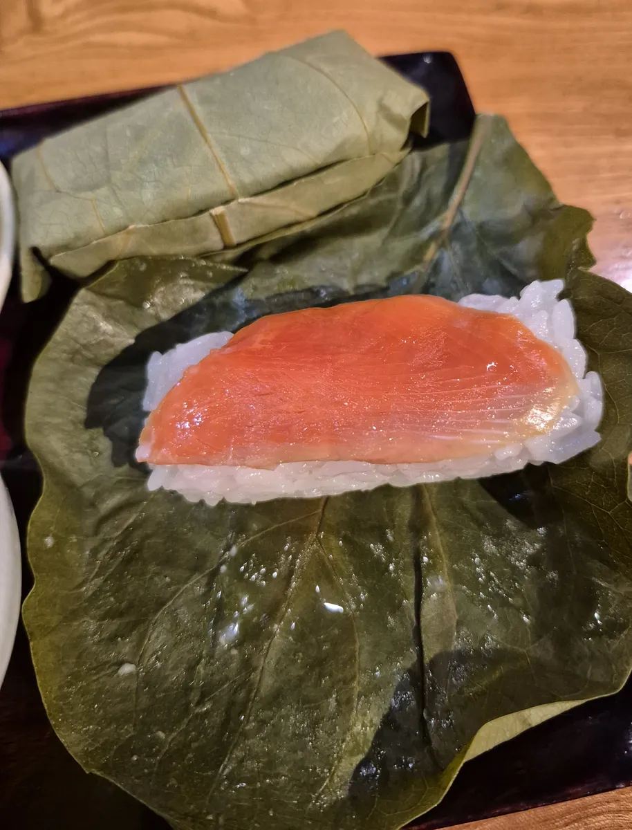 ↑↑昼のおきまりの“柿の葉寿司(シャケ)”