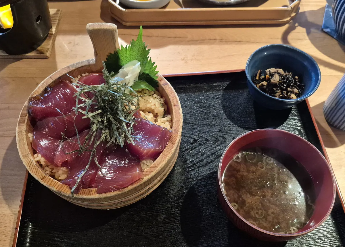 ↑↑てこね寿司(梅)1500円♪︎~。醤油ダレに漬け込んだカツオやマグロなどの刺身と酢飯を,「手でこねて」混ぜ合わせたお寿司です。大葉や生姜などの薬味をたっぷり散らして食べ,漁師の家庭料理がルーツといわれています。