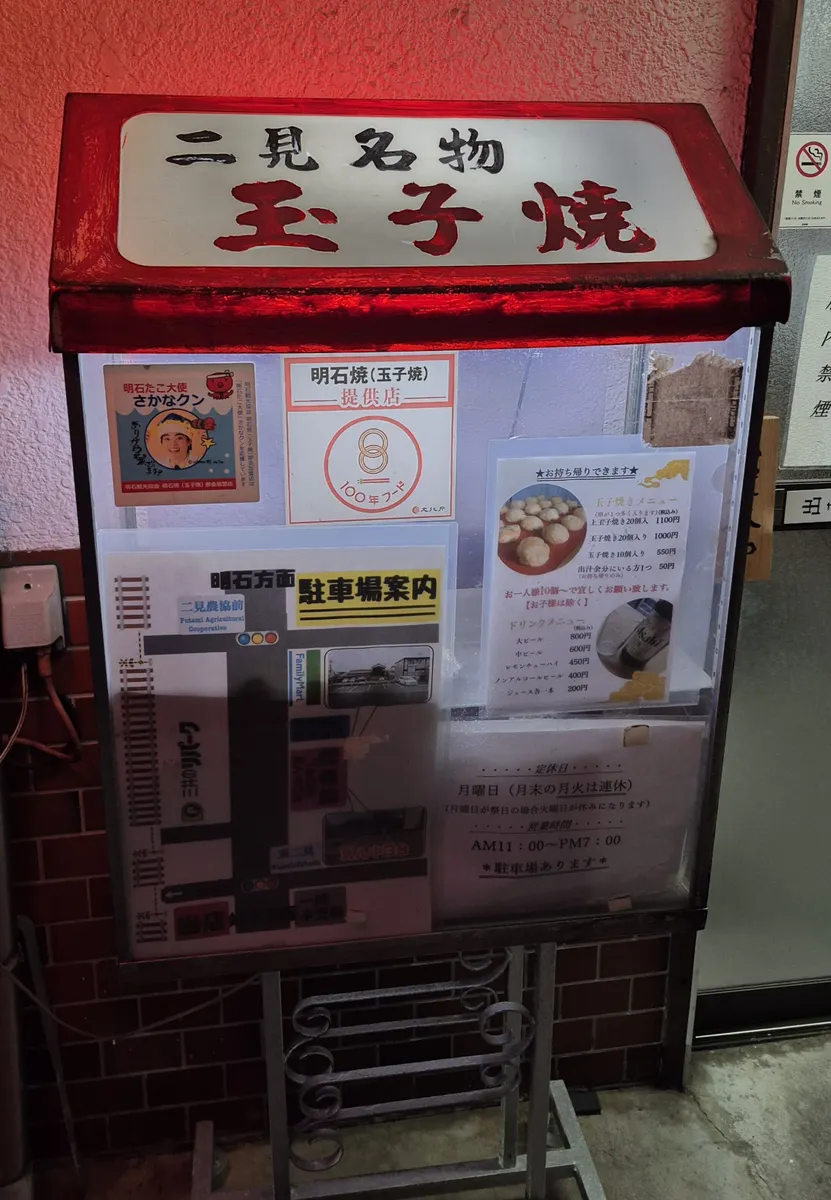 先日のドライブ…大阪を出発し,神戸市を通過,明石市を走行中,1本の電話が…。運転中,電話に出れないので,近くのコンビニに立ち寄り,折り返しTELをする。会社からの電話でした…部下からの業務上の質問で,普通に答えて終了。再び,道路に戻りましたが,コンビニの場所が,交差点近くで,左折しか出来ない車線(本来なら直進)に出る。仕方なしに,左折し遠回りする。その時,以前,妻と行った事がある“玉子焼(明石焼)”のお店の前を通過するルートになった事に気付き…。妻に立ち寄るか訪ねたら…当然の答えが!。立ち寄る事にしました。下記の食べログURL参照。