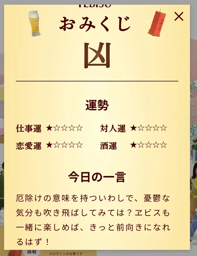 久しぶりの「凶」でした。アドバイスでは「いわしで憂鬱な気分を吹き飛ばしてみては?」と言われましたが、いや、いわしはソレなりに調理が大変だし,ねぇ。まぁ、憂鬱ではないので問題ないです。あと、いわしの料理は作ったことがないので無理です 汗