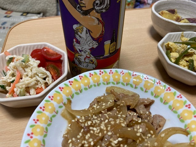 はい、作ったのは白ゴマが多めの「豚ロースの生姜焼き」と、味噌汁だけです。あとは作り置きのおかずばかり。切り干し大根のサラダ、ピーマン・玉ねぎと玉子のオイスター炒め、あとは大学芋。まぁ、こんな ふうに「楽をしたい日」もありますよね。