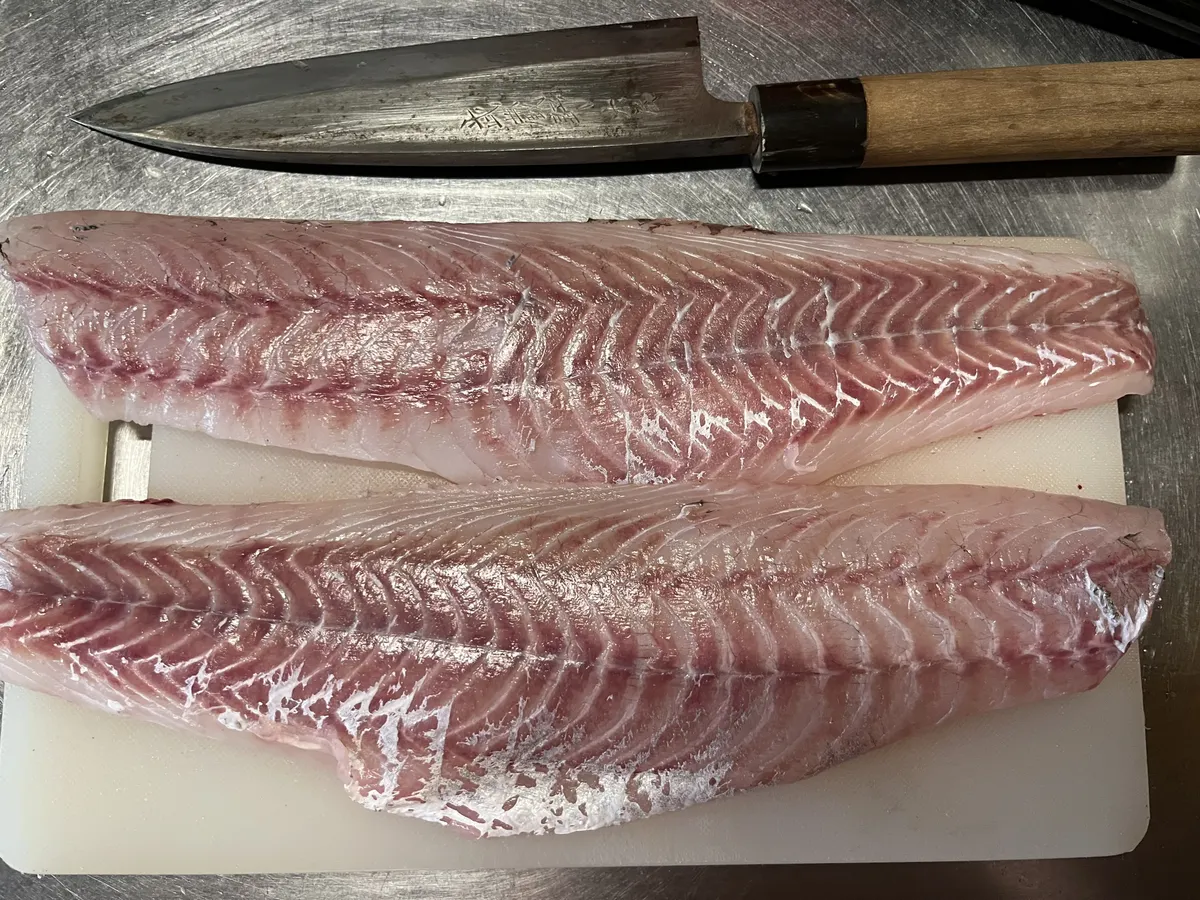 主役の鱸 魚屋さんを信じないわけじゃないけど🤣💦自分で捌いた方が歩留まりもいいし なんたってそのほうが 魚屋さんより上手いし😝 で、捌いた様子がこちら👇