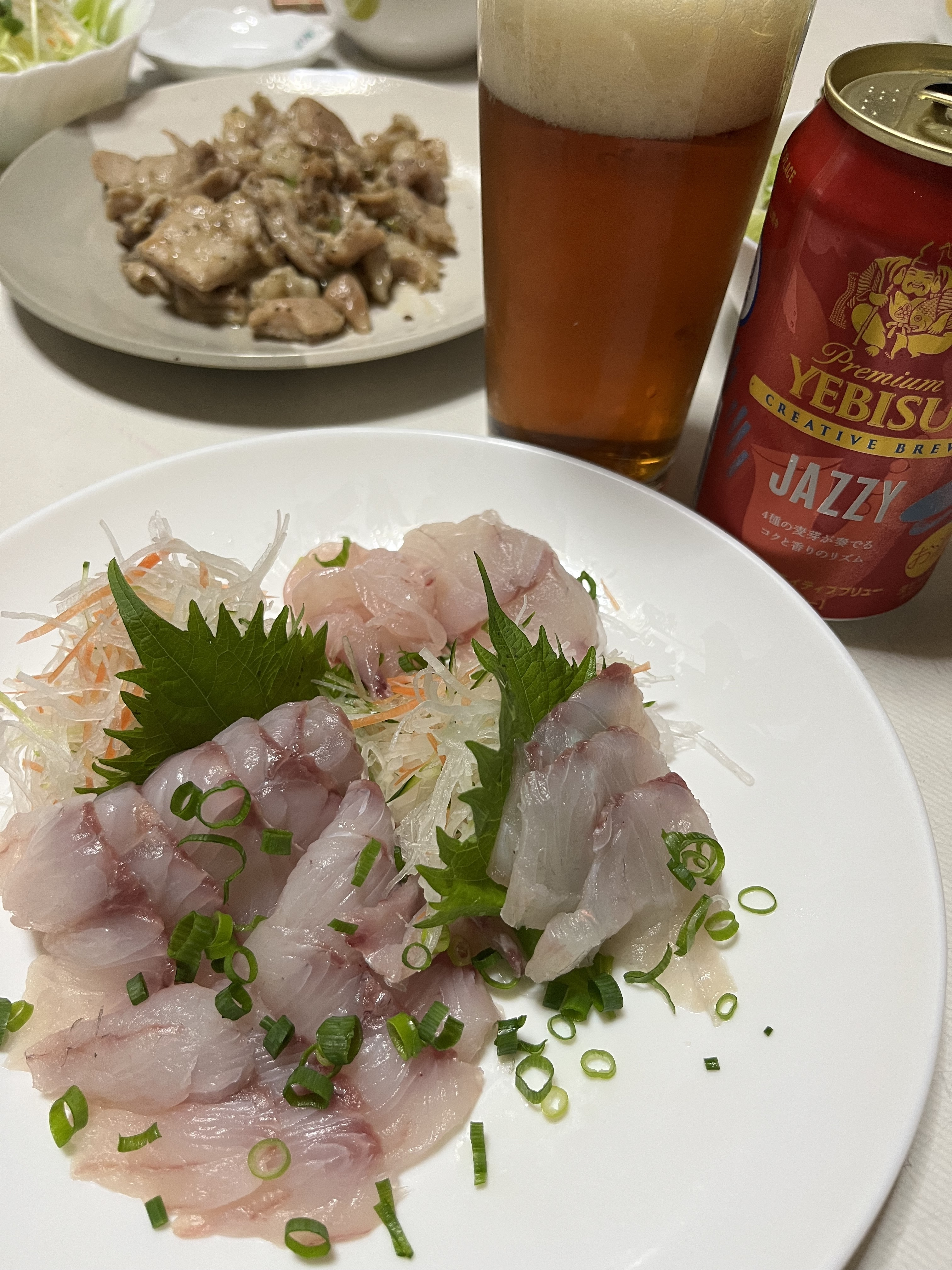 鱸のお刺身とJAZZY🍺で晩酌🍻🍻♬