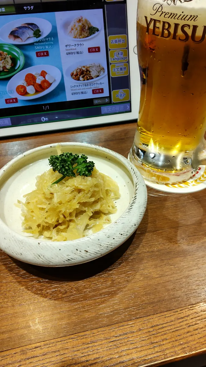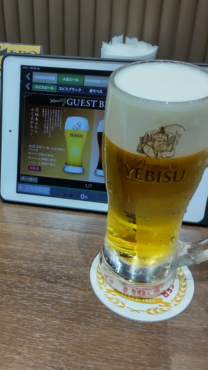 一杯目は先月のジョッキくじで当てたジョッキ一杯券でヱビスのジョッキ、ありがたい。😊