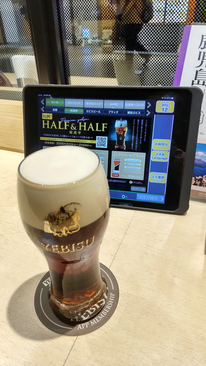 ヱビスバーではスタンプ稼ぎたため自腹でいきます。HALF&HALF総選挙が開催中でアンバー&ブラックからスタート。