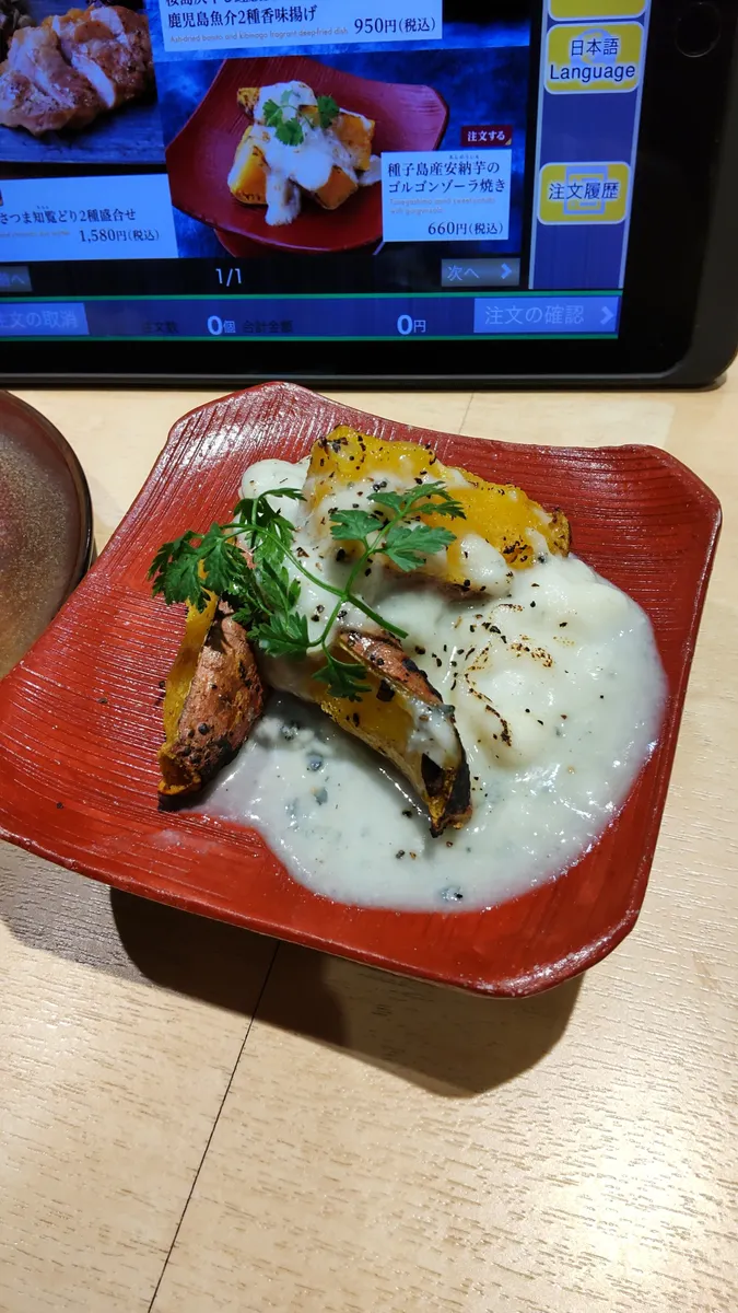 鹿児島フェア、安納芋のゴルゴンゾーラ焼き。あとはレギュラーメニューを数品食べつつ…