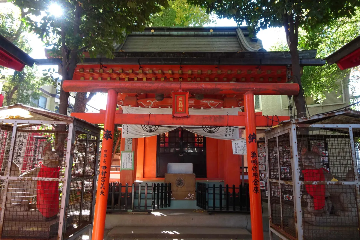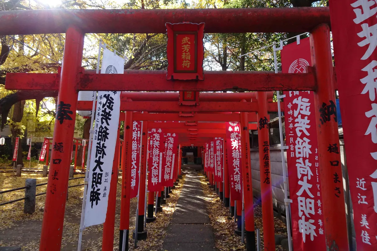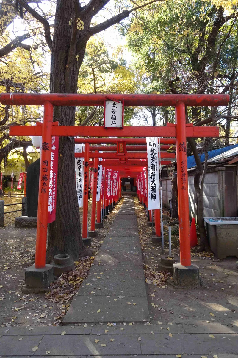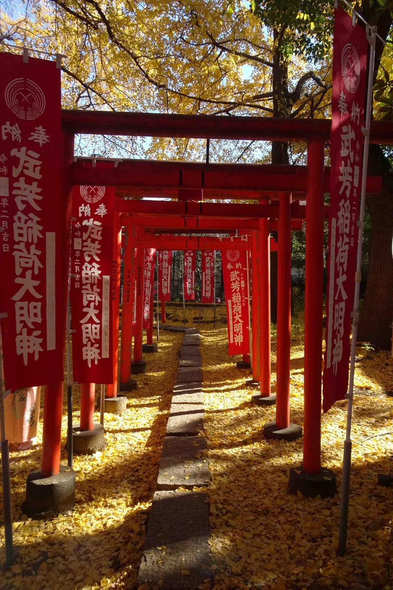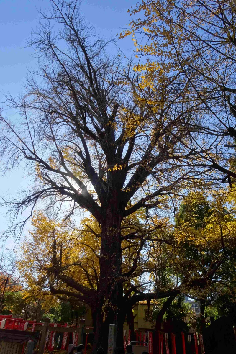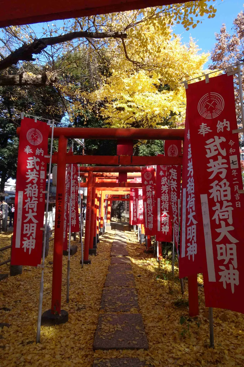その公孫樹を囲むように、朱い鳥居が凹型に並んでいます。