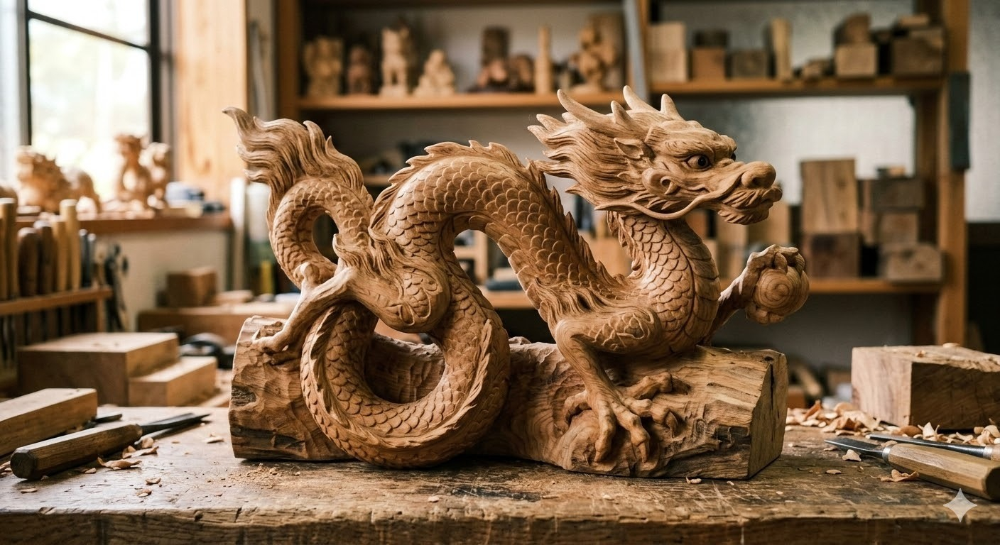 木彫りの龍⇨昇り龍 (宿題やれよ 風呂入れよ セリフはドリフみたい👍)