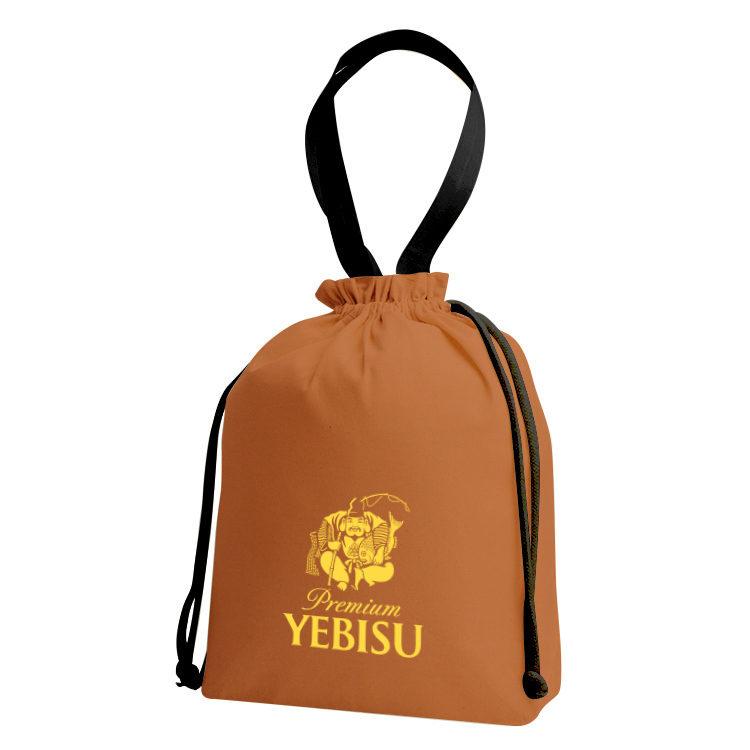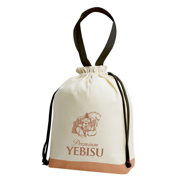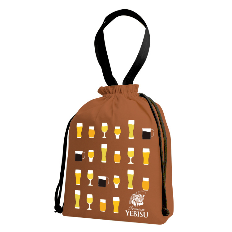 YEBISU BREWERY TOKYOのイメージカラーであるブラウンと白のバイカラーのデザイン。YEBISU BREWERY TOKYOのロゴと、巾着のカラーがよく馴染んだ統一感のあるデザインです。