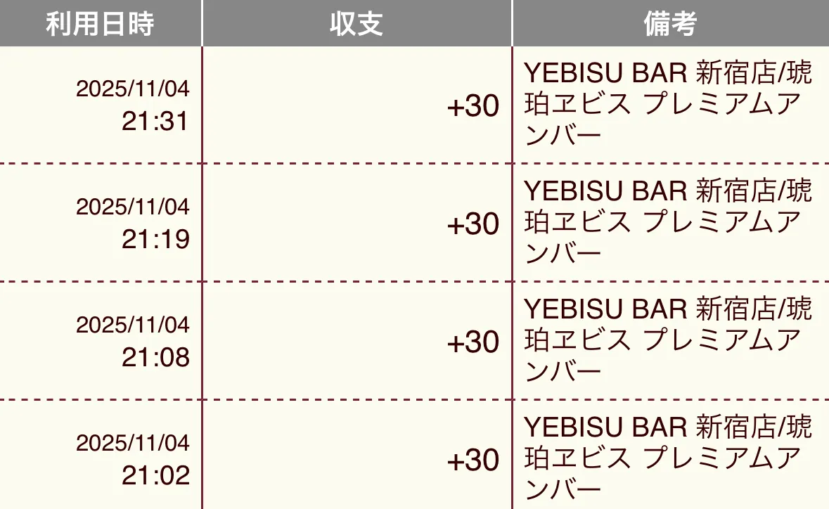 トップ > ヱビスフォト > YEBISU BAR > くじはなかなかない当たらないけど勝率2割5分 rainbow🌈 2025/11/04 22:15 くじはなかなかない当たらないけど勝率2割5分 ジム活帰りのちょっとした時間にYEBISU BAR新宿店に21時立ち寄り 21時30分にラストオーダーと言うこと理解した上でくじを目当てに琥珀をオーダー くじは立て続けにハズレばかり😅 なかなか当たらないな〜と諦めモードの中 スタッフYさんから引いたくじが2等でした🤩 その瞬間Yさんが女神に思えました😍 会計時のレジもYさんでしたので、ちょっとだけお話しして 気分良く帰宅できました😊 プレミアムアンバー いいね 共有する 共有する X facebook LINE リンクをコピー コメントする 2 件の返信 (新着順) ミュートしたユーザーの投稿です。 投稿を表示 ヱビス狂 2025/11/06 16:46 えっ⁉️ 先日の練習の成果が🤣 いいね 返信する ミュートしたユーザーの投稿です。 投稿を表示 rainbow🌈 2025/11/06 16:52 ヱビス狂さん 練習の成果が出せませんでした😂 いいね 返信する ミュートしたユーザーの投稿です。 投稿を表示 ちゃちゃるー 2025/11/04 23:18 狂さまがうらめしそうに見ている…(ΦωΦ) いいね 返信する ミュートしたユーザーの投稿です。 投稿を表示 rainbow🌈 2025/11/06 16:51 ちゃちゃるーさん えっ⁉️ やばっ🤣 いいね 返信する ミュートしたユーザーの投稿です。 投稿を表示 ちゃちゃるー 2025/11/06 19:25 ハズレばっかりひいちゃって、かわいそうな狂サマ…😁 いいね 返信する
