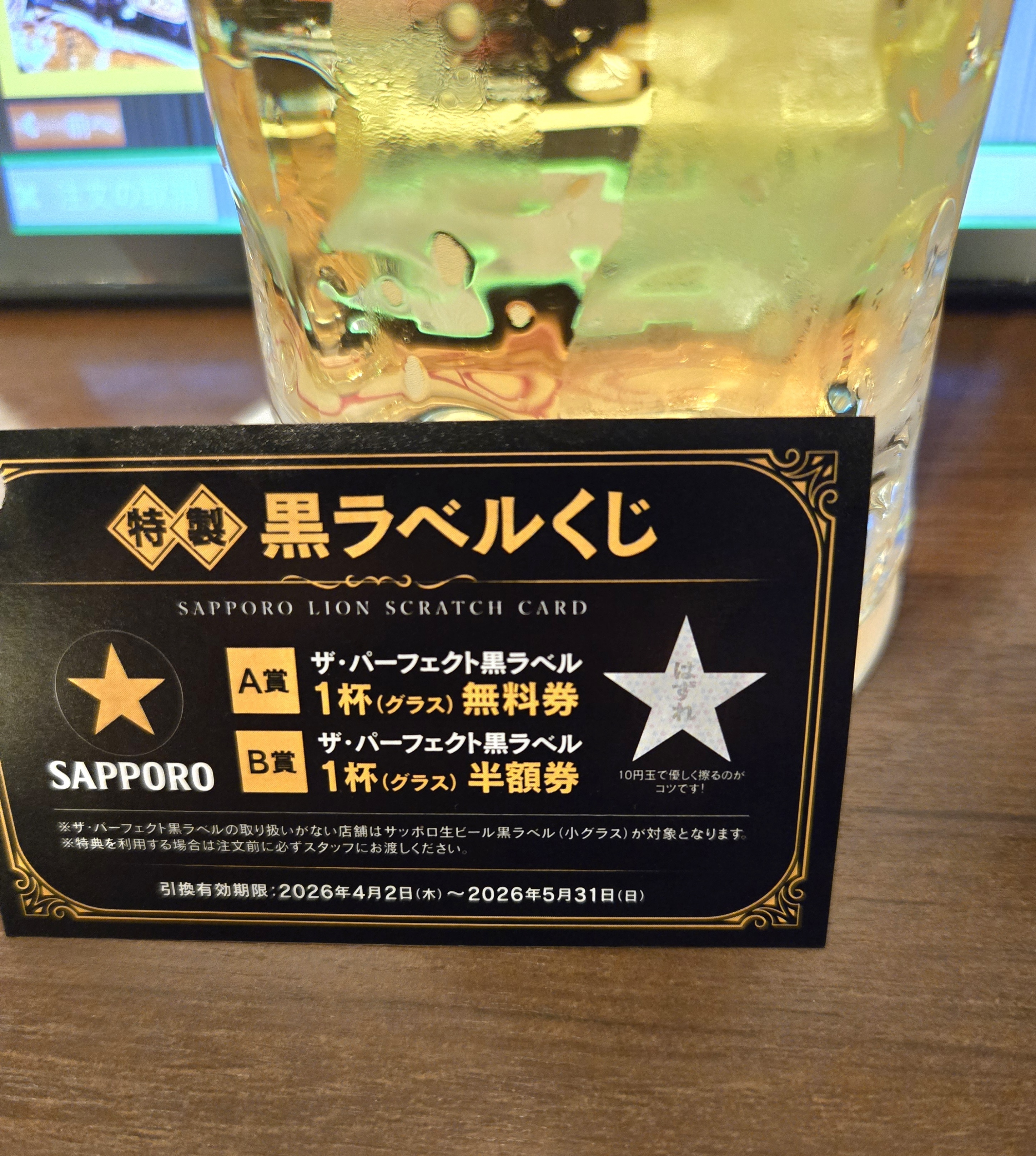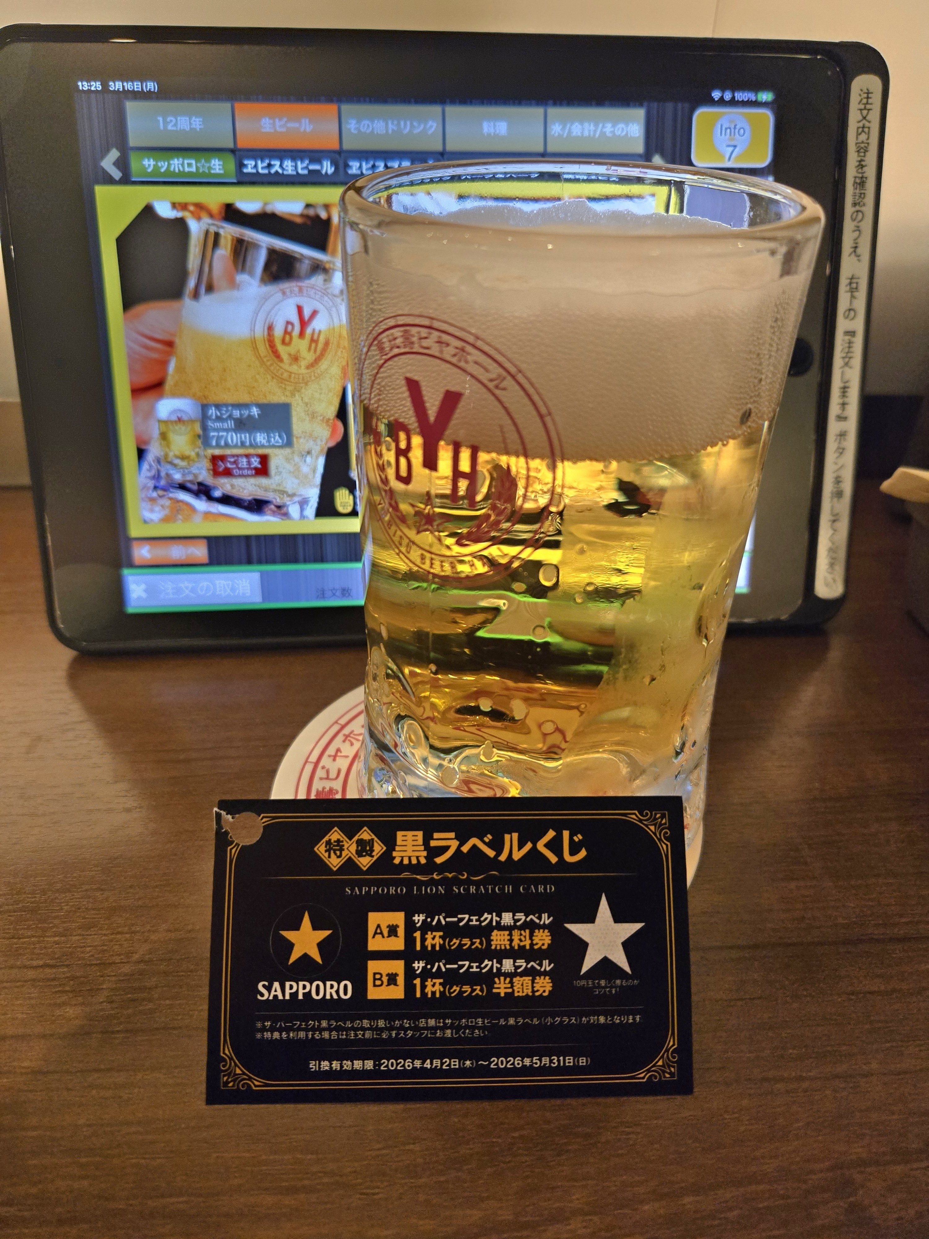 惠比壽ビヤホールではパーフェクト黒ラベルの取り扱いがないので、小ジョッキにてくじ引きました😊