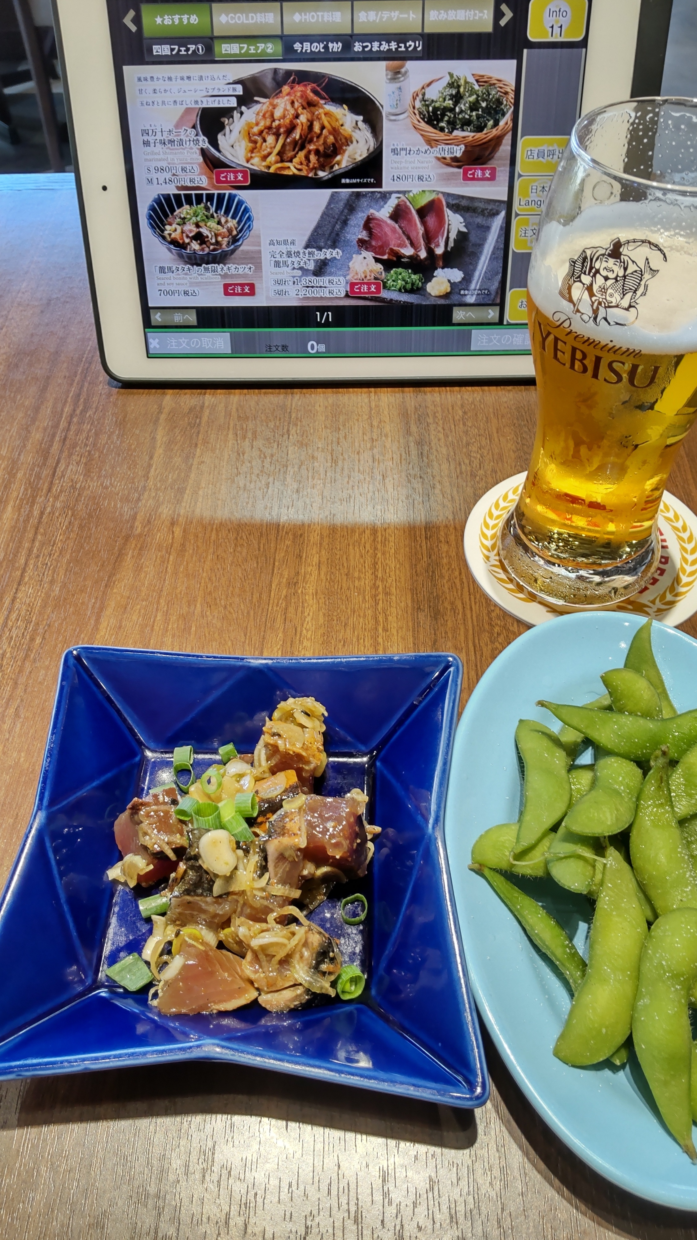 四国フェア、「龍馬タタキ」の無限ネギカツオと枝豆。タタキは普通に食べるのが一番おいしいと思いました。