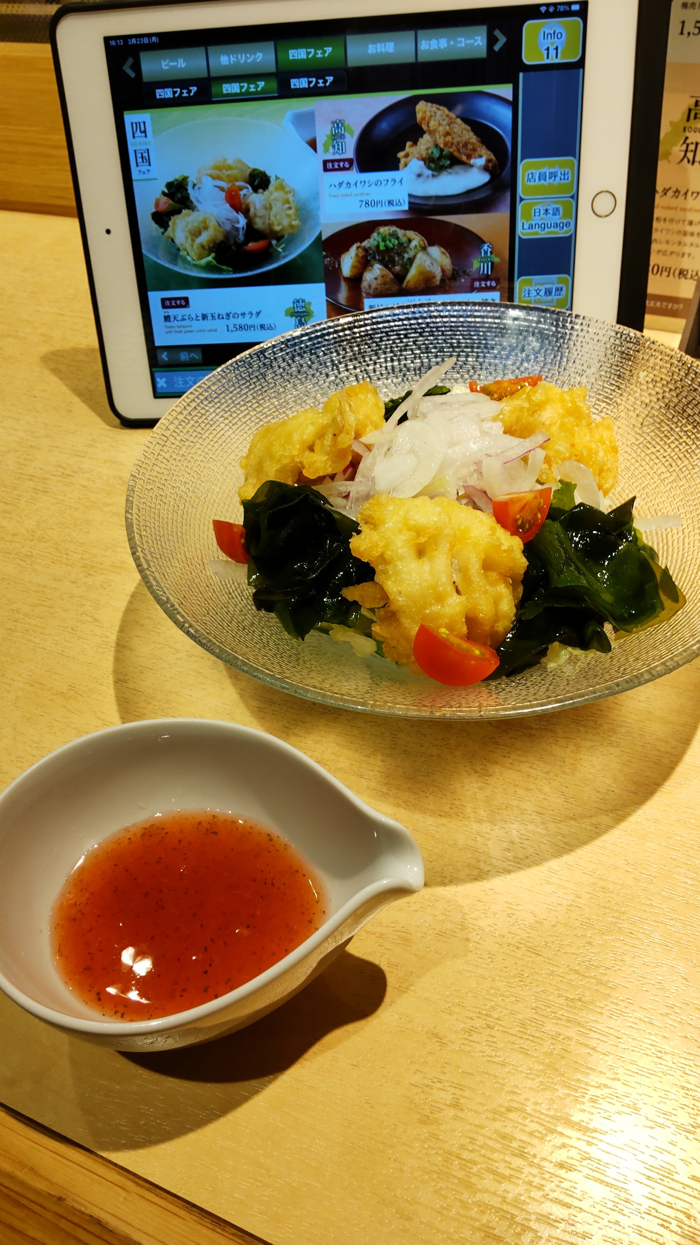 四国フェア、鱧てんぷらと新玉ねぎのサラダ。
