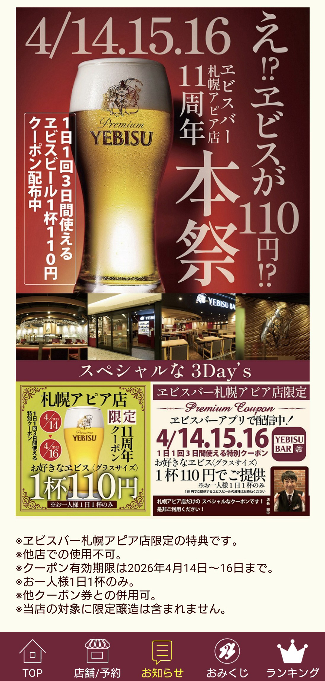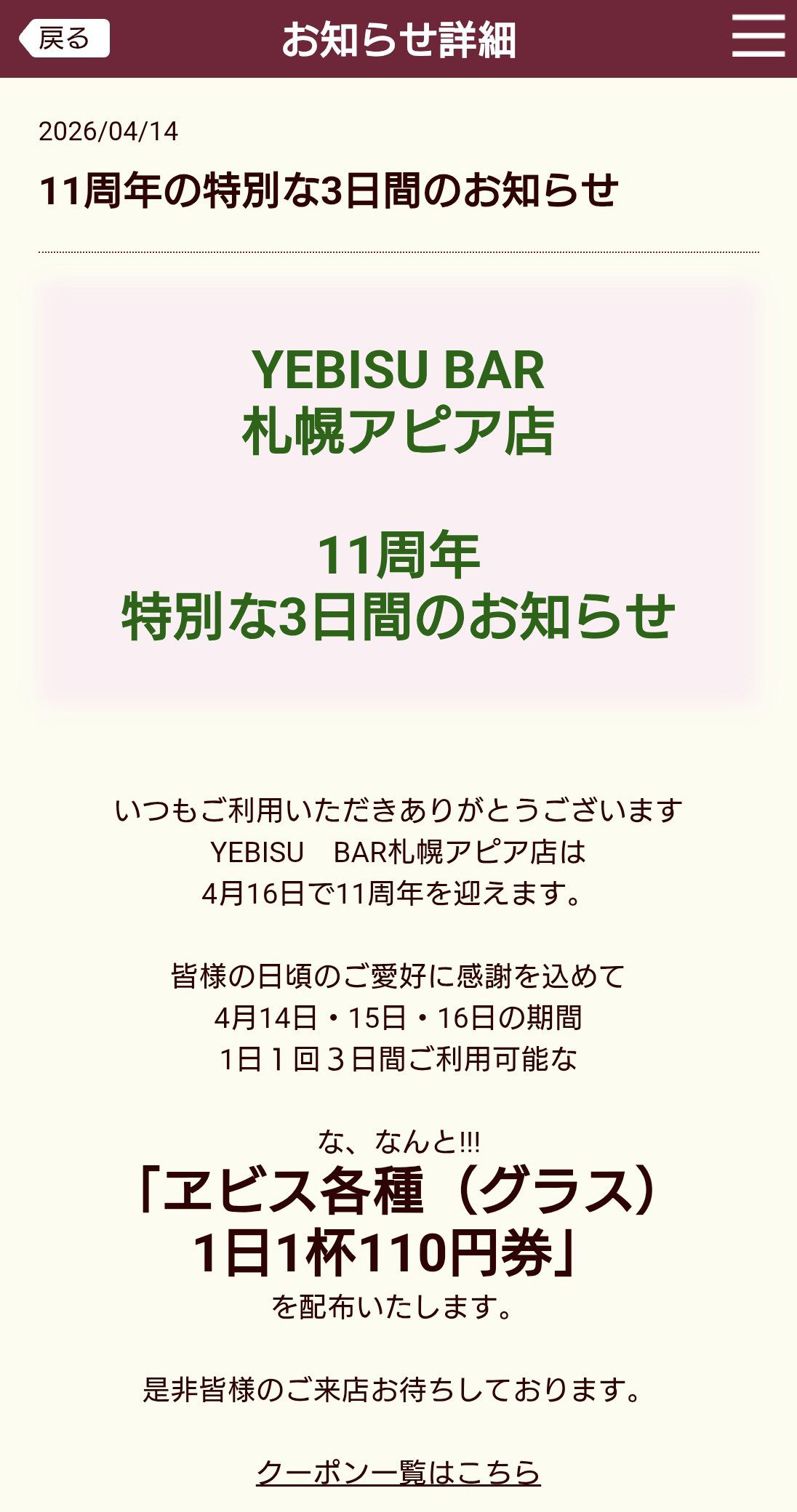 ☆アピア店の生誕11周年「本祭」ということで、アプリにクーポンが届きました・・・が、