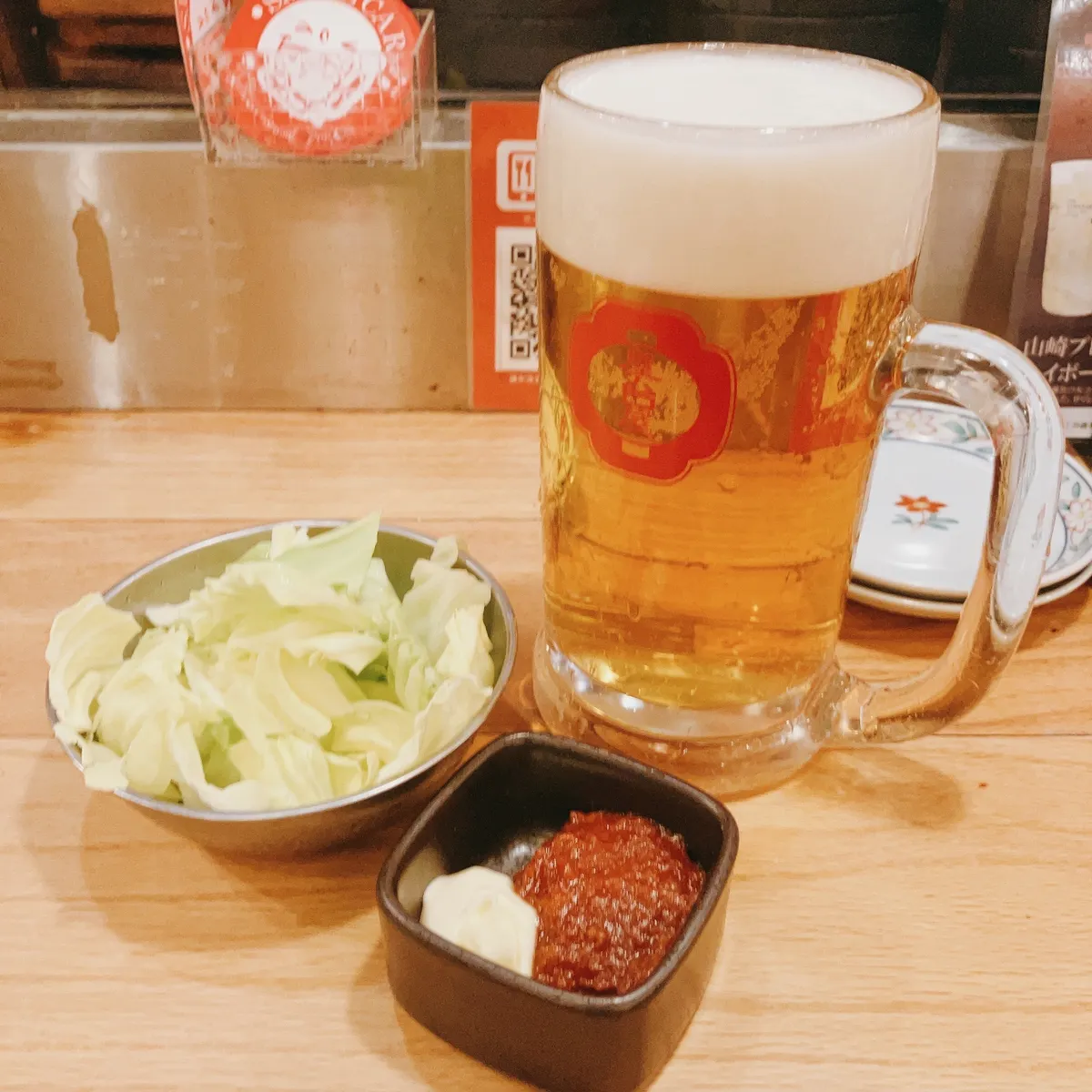 VIP会員のため毎回乾杯ビールが通常サイズジョッキの料金変わらず、香るエールプレモルがどでかジョッキ(1リッター)で頂けます。またお通しの無限キャベツも無料という特典。