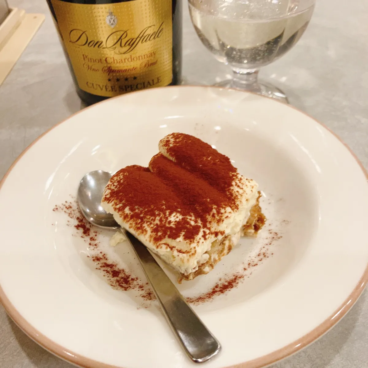 イタリア産のこの泡がコスパ良き!¥1,100でこの美味さ。アテはティラミスクラシコ¥300!これも大好物!どちらもマジ美味い!以前から大好きさ。