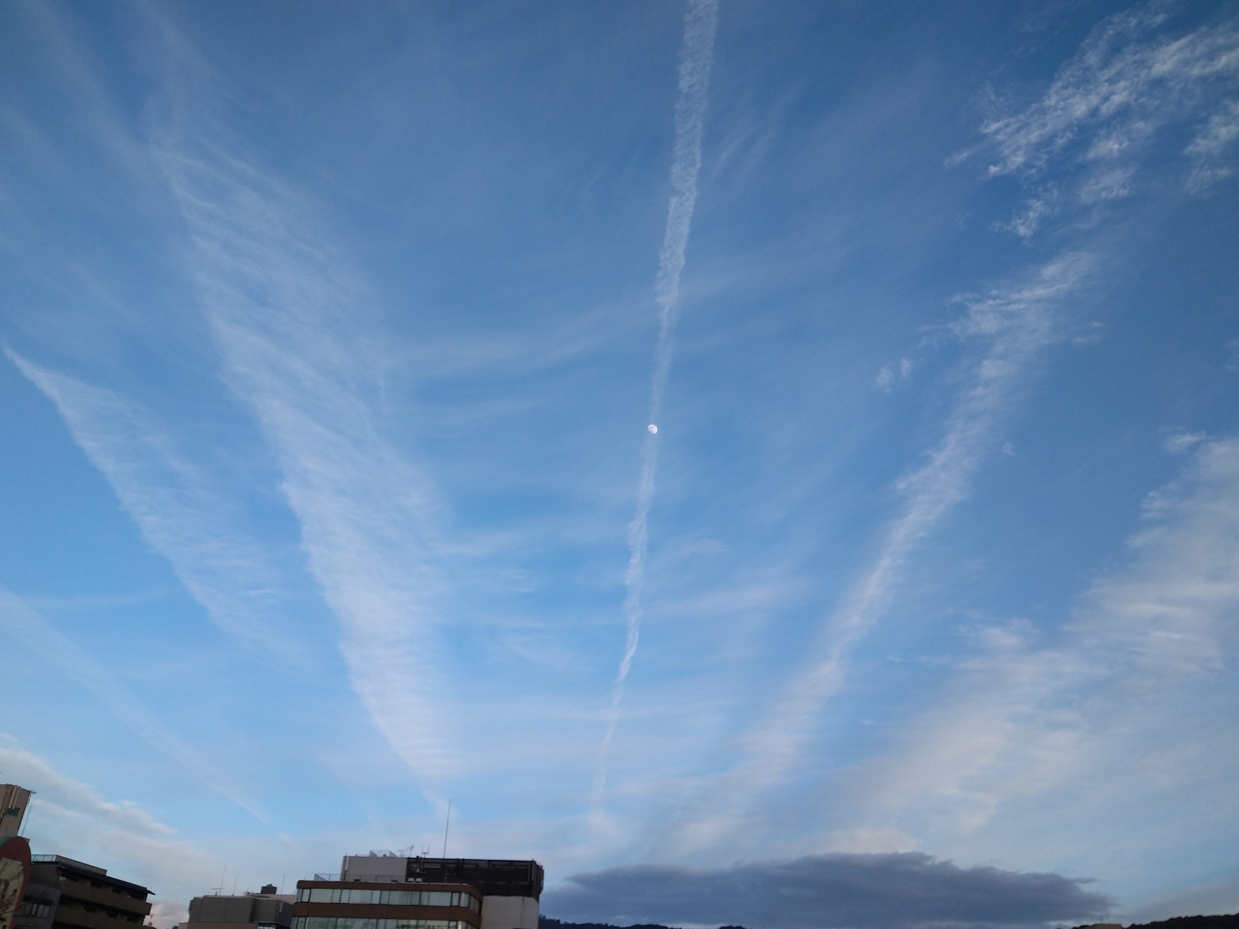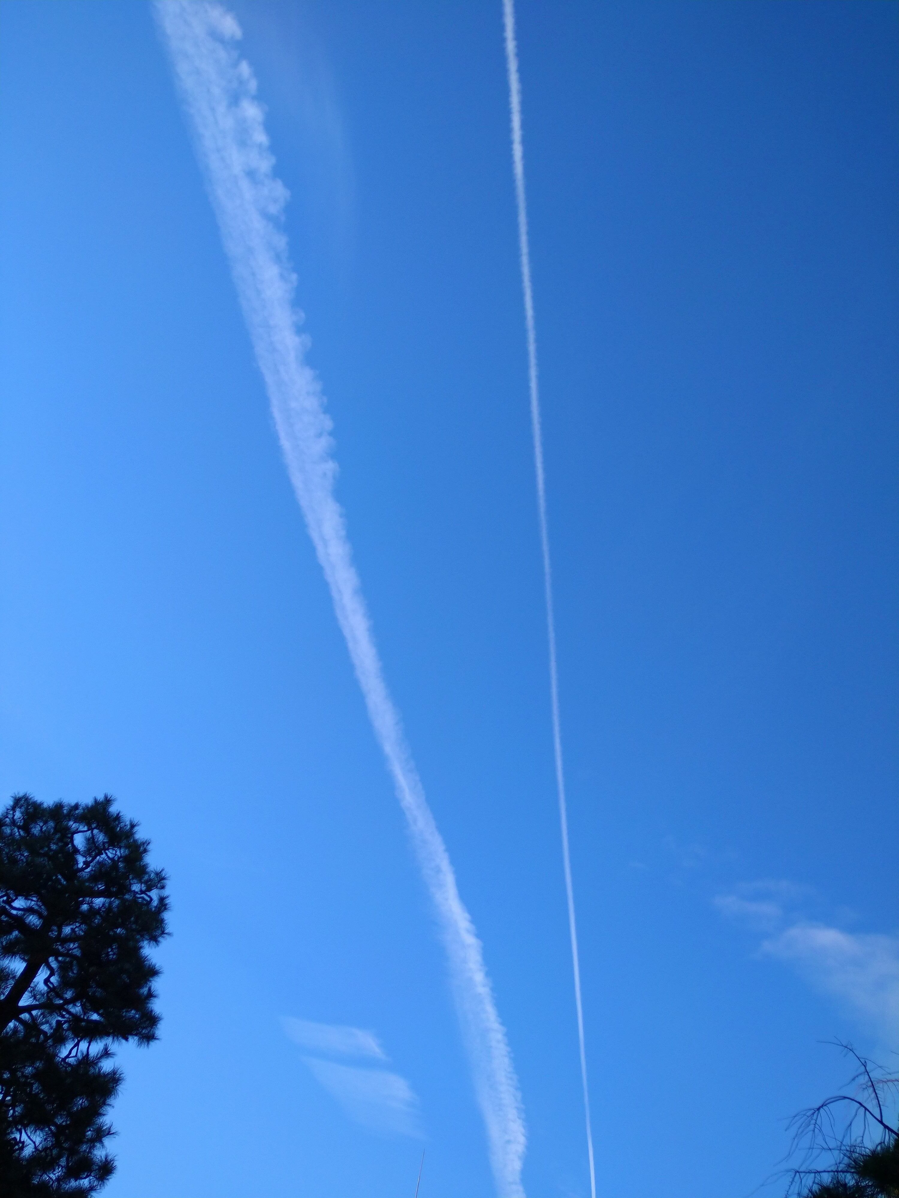 空には飛行機雲と不思議な筋雲が並んでいました。