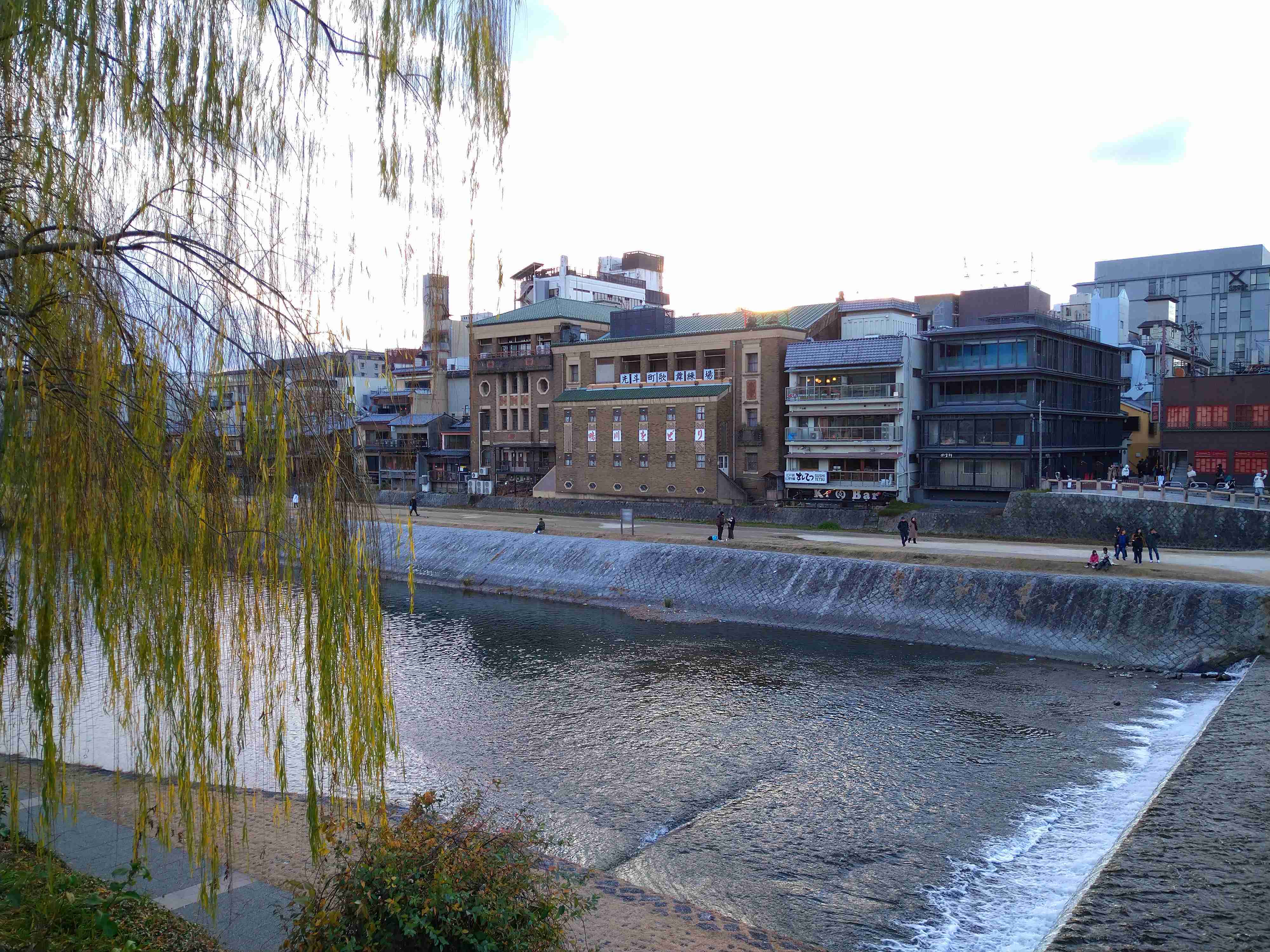 真ん中に見える茶色い建物は先斗町歌舞練場で、毎年1回「鴨川をどり」という舞妓さんたちが舞踊などを演じる演目があります。
