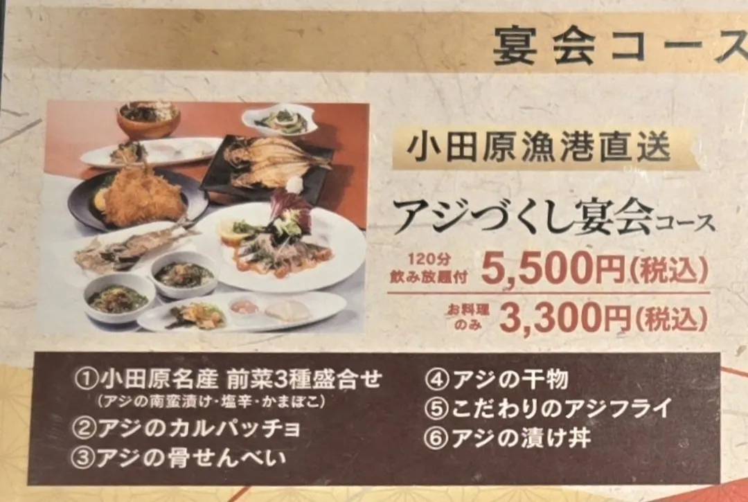 短時間でガンガン飲むほうではないので、アジづくし宴会コースの料理のみ注文、ヱビスジョッキ祭りをやっていたので、ヱビスビールジョッキを注文🍺